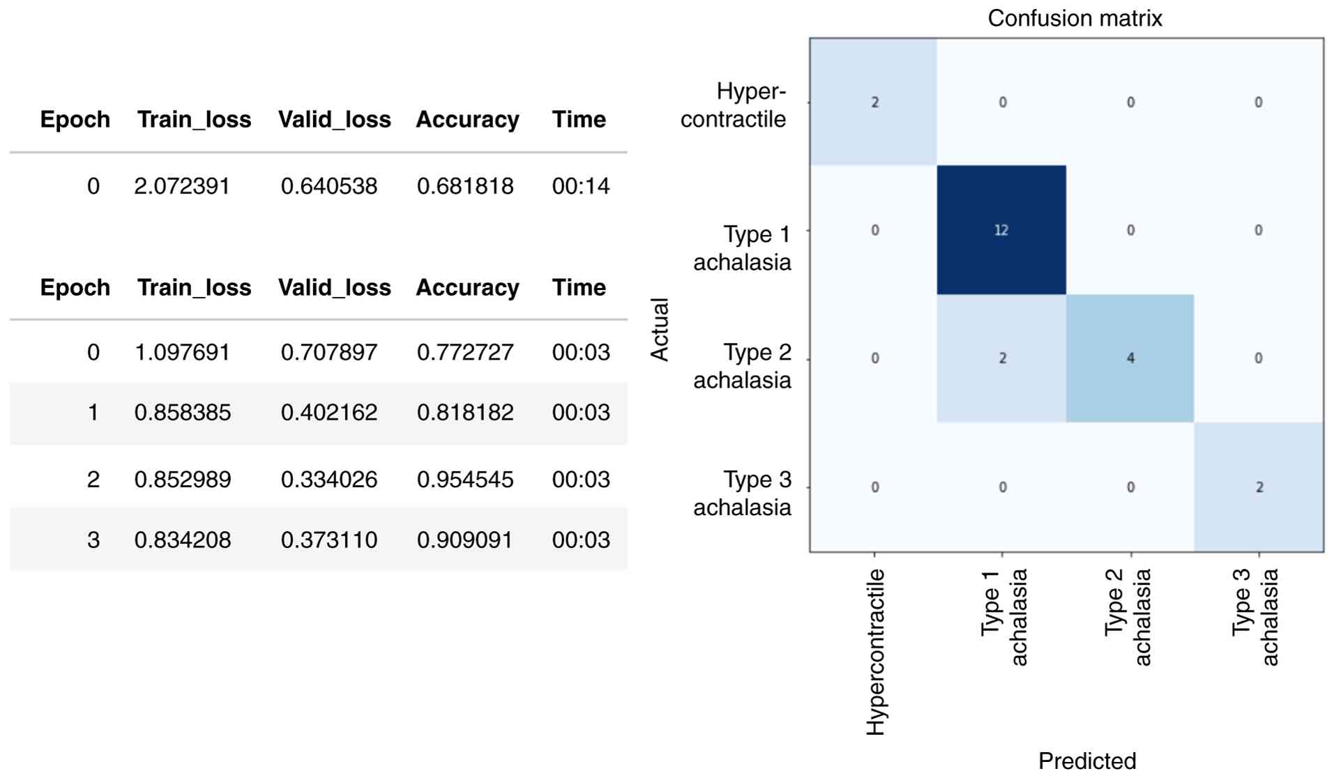 The difference in HRM features between the controls and patients with achalasia, even in the absence of a large number of HRM images, suggests that deep learning may be predominantly predictive of the disease. Thus, predictors of each type of achalasia were developed using the same methods.