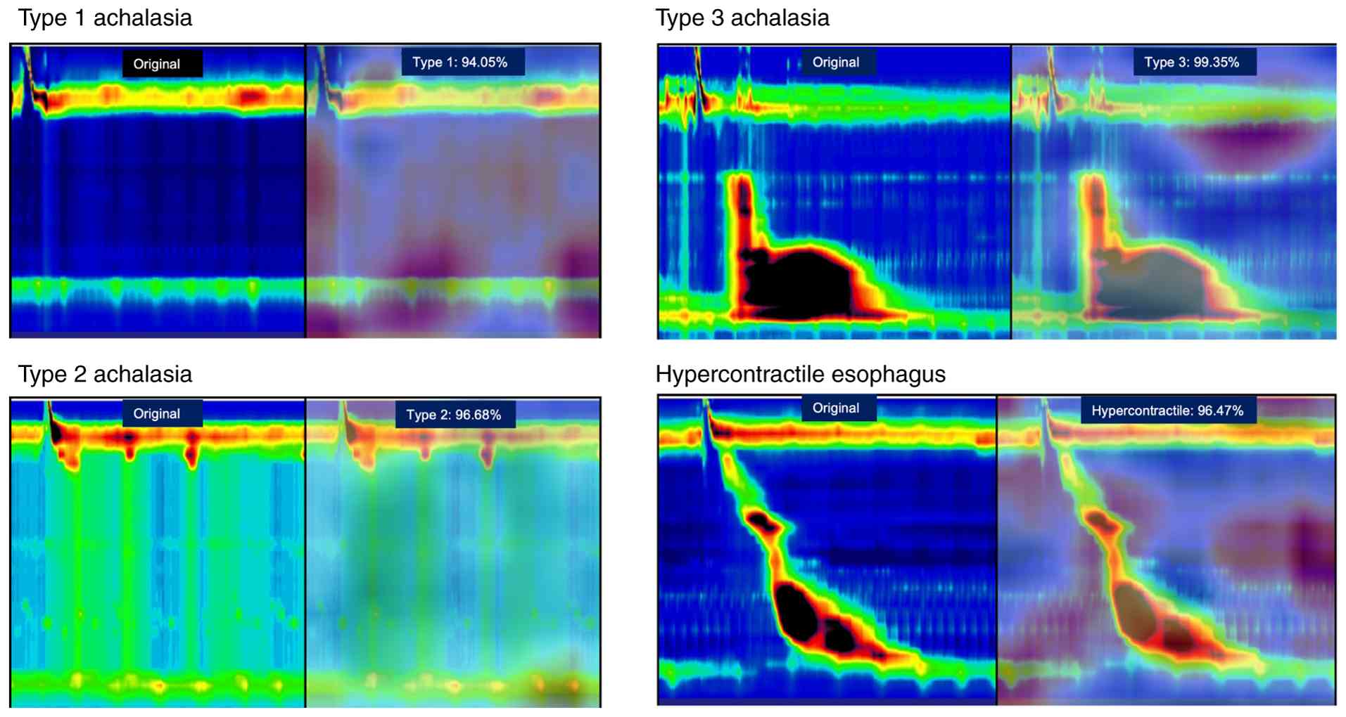 When reexamining the areas of focus of Grad-CAM, we found that pan-esophageal pressurization, which is continuous with upper esophageal sphincter contraction, is a feature of type 2 achalasia (Fig. S3). Interestingly, these features are not found in type 1 achalasia, suggesting that they may be imaging features of type 2 achalasia.