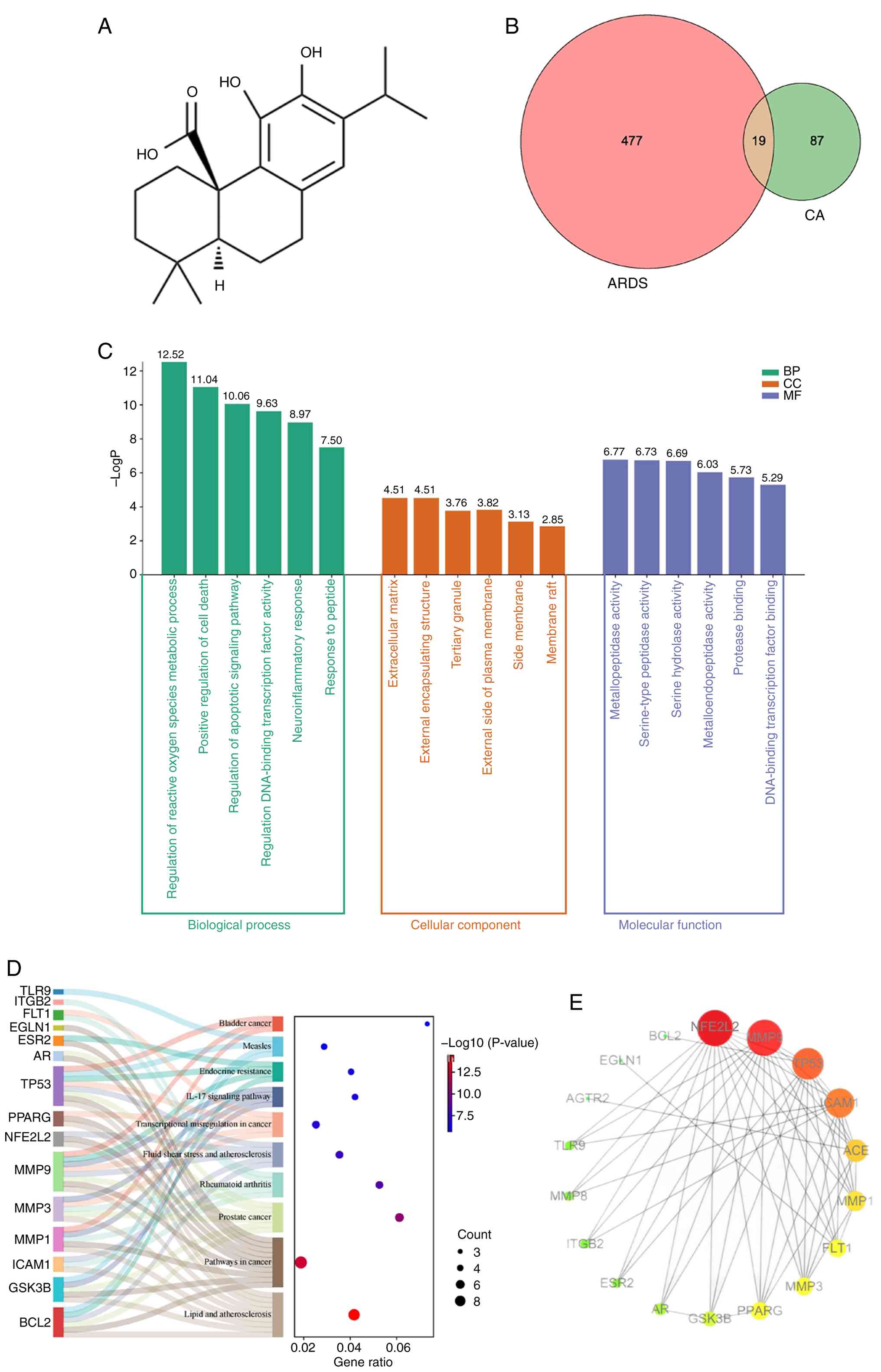 Potential targets for CA were predicted using the SwissTargetPrediction database (http://www.swisstargetprediction.ch). ARDS-related targets were identified using public databases, including the GeneCards database (https://www.genecards.org/) and the DisGeNET database (version 7.0; http://www.disgenet.org/). To identify relevant targets, the search terms ‘ARDS’, ‘acute lung injury’, ‘acute respiratory distress syndrome’, ‘adult respiratory distress syndrome’ and ‘acute lung injury’ were used. In the GeneCards database, target selection was carried out using the following criteria: i) Ranking targets by their relevance score; ii) retaining only those with a score >2 times the median value and iii) identifying and presenting the common targets between CA and ARDS using a Venn diagram.