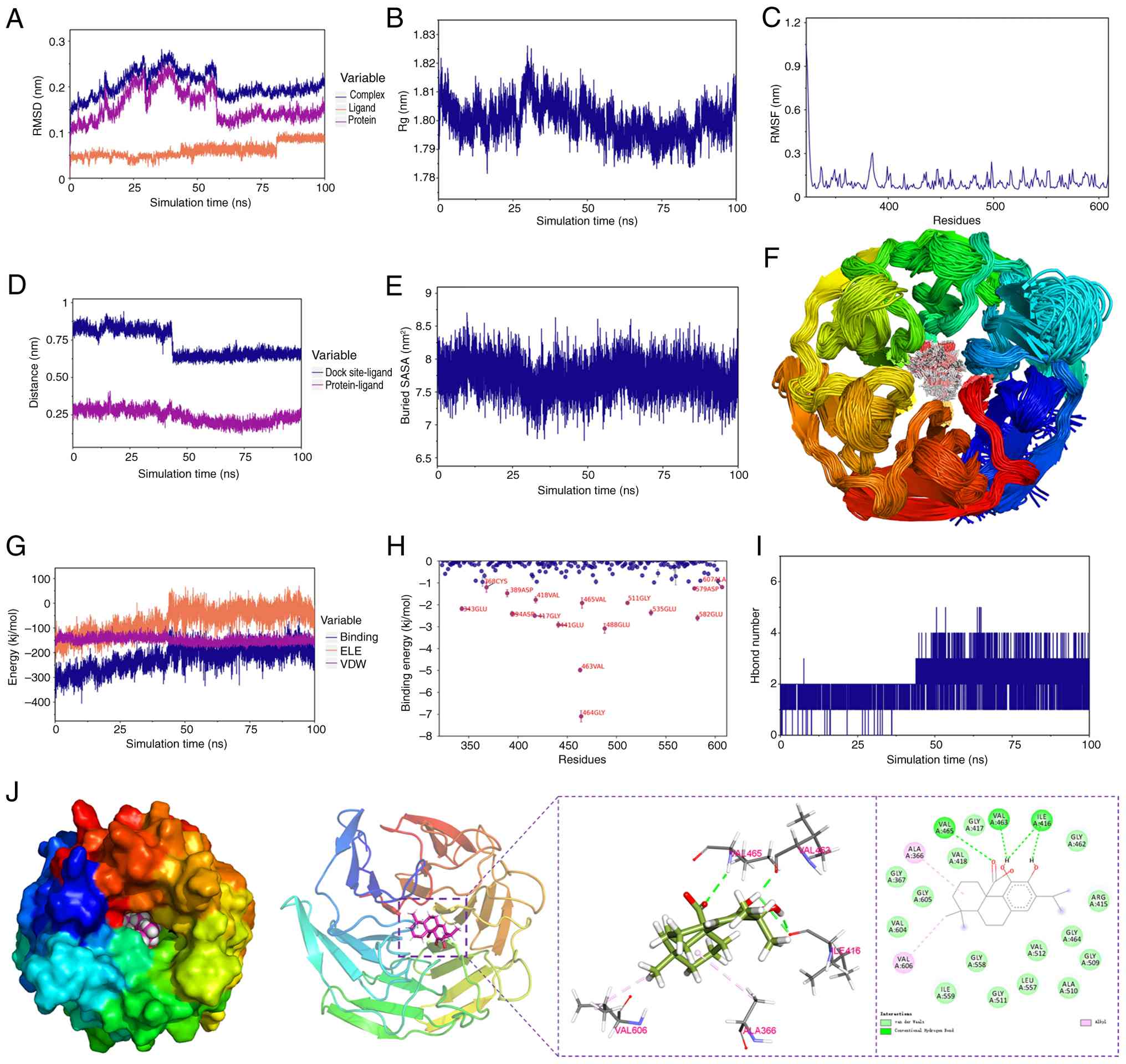 MD. Groningen Machine for Chemical Simulations (GROMACS; version 2022.4; http://www.gromacs.org) was used to carry out MD simulations, which were all executed under isothermal-isobaric ensemble conditions simulating a system with a constant number of particles, temperature and pressure (NPT) with periodic boundary constraints. The linear constraint solver algorithm constrained hydrogen bonds with a 2 fsec integration time step. Electrostatic energy (ELE) interactions were calculated using the particle-mesh Ewald method, with a 1.2-nm cutoff (17), while van der Waals (VDW) interactions employed a 10 Å cutoff distance, updated every 10 steps. Temperature (298 K) and pressure (1 bar) were maintained using the V-rescale thermostat and Berendsen barostat algorithms, respectively (18). The system underwent sequential equilibration under the protocol of 100 ps (constant number of particles, volume and temperature) followed by 100 ps NPT, before a 100 ns production run, with trajectories saved every 10 ps. Post-simulation analyses included trajectory visualization using Visual Molecular Dynamics (https://www.ks.uiuc.edu/Research/vmd/) and PyMOL, along with binding free energy calculations using the GROMACS package ‘g_mmpbsa’ (19). Key evaluation metrics comprised: i) System stability parameters (RMSD of complex protein and ligand; radius of gyration of complex; root mean square fluctuation of protein residues); ii) interaction characteristics (binding site distance, buried solvent-accessible surface area, VDW/ELE energies, hydrogen bond dynamics and per-residue energy contributions); and iii) structural features (conformational superposition and interaction fingerprints). This comprehensive analysis protocol ensured rigorous assessment of the protein-ligand complex dynamics.