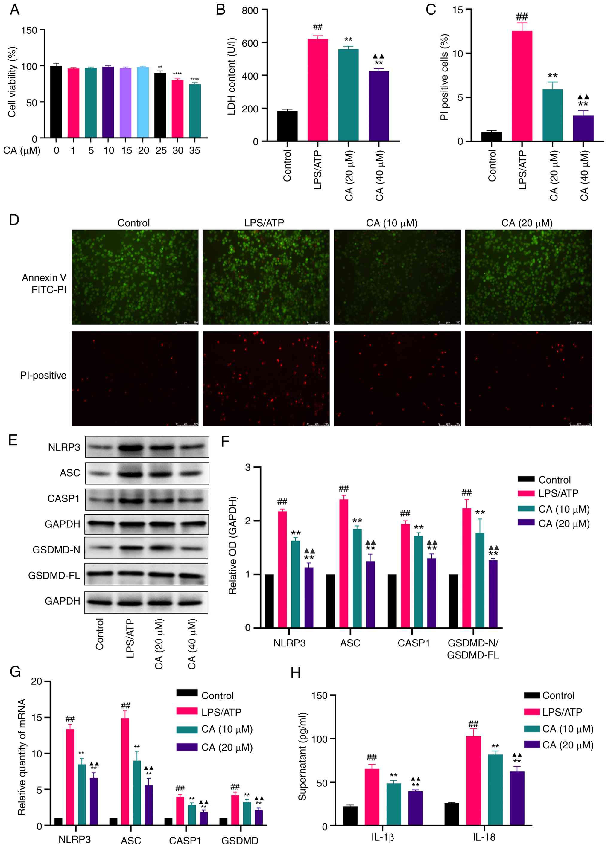 CA inhibits pyroptosis in LPS/ATP-stimulated MH-S cells. To assess the impact of CA on pyroptosis, MH-S cells were treated with LPS and ATP. Pyroptosis was then quantified by measuring the proportion of PI-positive cells (Annexin V-FITC and PI double staining, a combination of methods evaluating membrane integrity and inflammasome activation) and LDH levels in the cell supernatant. The findings indicated a notable reduction in both LDH release (Fig. 3B) and PI-positive cells (Fig. 3C and D) following CA treatment. During the early stages of apoptosis and pyroptosis, phosphatidylserine becomes externalized on the cell membrane. However, pyroptosis ultimately leads to complete membrane rupture. Consequently, a cell population positive for Annexin V-FITC (green) and negative for PI (red) indicates an early stage of cell death, while cells positive for both Annexin V and PI represent a later stage characterized by loss of membrane integrity. The results demonstrated that LPS/ATP stimulation significantly increased the proportion of double-positive cells, an effect that was effectively reversed by CA treatment. To assess NLR family pyrin domain containing 3 (NLRP3) inflammasome activation, key markers were examined, including apoptosis-associated speck-like protein containing a CARD (ASC), caspase-1 (CASP1), the N-terminal fragment of GSDMD and the downstream cytokines IL-18 and IL-1β. CA treatment significantly inhibited the protein expression of these key markers induced by LPS/ATP and their corresponding mRNA upregulation (Fig. 3E-G). Furthermore, CA markedly attenuated the release of IL-18 and IL-1β in the supernatant compared with the LPS/ATP-stimulated group (Fig. 3H). Collectively, these outcomes indicated that CA may effectively hinder LPS/ATP-induced pyroptosis in MH-S cells by inhibiting NLRP3 activation and averting GSDMD cleavage.