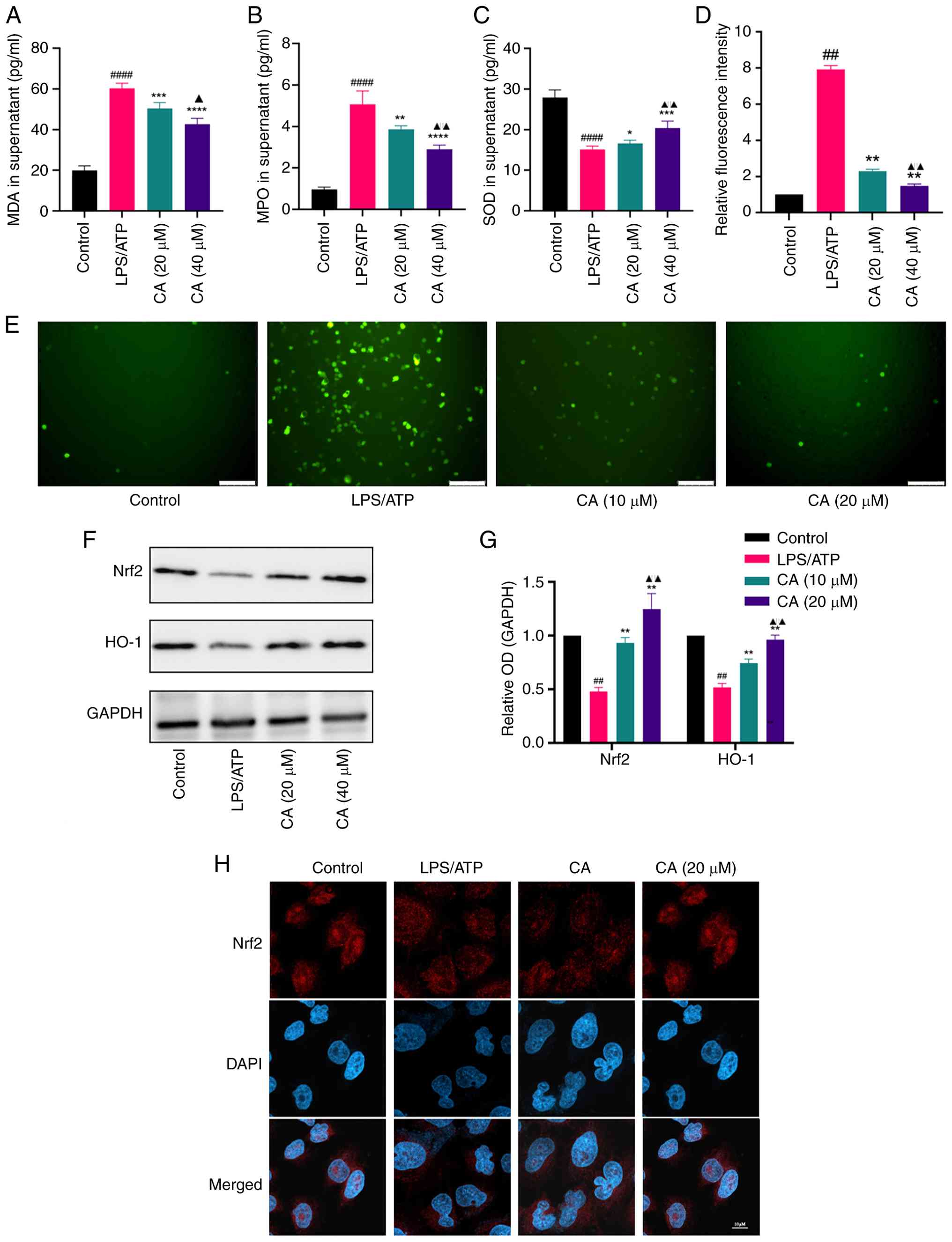 CA activates Nrf2 and alleviates oxidative stress in LPS/ATP-stimulated MH-S cells. CA has previously been documented to exhibit potent antioxidative properties (28); however, its protective effects against oxidative stress in MH-S cells remain unclear. Thus, the antioxidant effects and underlying mechanisms of CA in LPS/ATP-challenged MH-S cells were investigated.