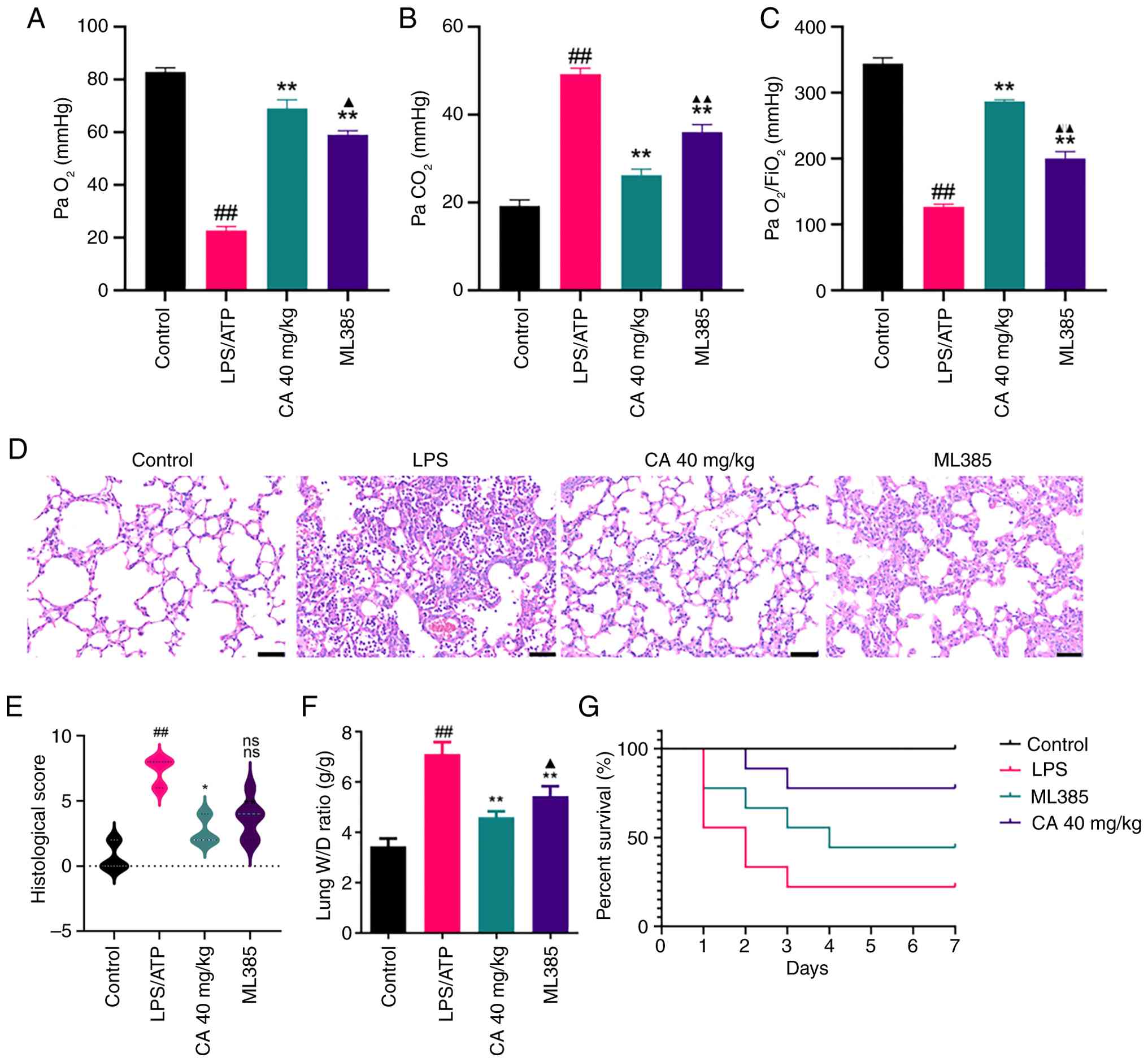 In the survival study (n=9 per group), mice received the following treatments: The ARDS model was induced by a single i.p. injection of LPS (10 mg/kg). After 30 min, the CA group received CA (40 mg/kg, i.p.), while the CA + ML385 group received ML385 (30 mg/kg, i.p.) followed by CA (40 mg/kg, i.p.), as previously described (23). Survival rates were recorded every 24 h for a 7-day observation period following LPS challenge and euthanized at the moribund stage. The humane endpoints were defined as the occurrence of moribund animal characteristics in the mice, such as severe or persistent lethargy, inability to rise from a recumbent position, convulsions, tetraplegia and dyspnea (24,25). Mortality was assessed through twice-daily monitoring (morning and evening) to ensure accurate determination of survival time points.