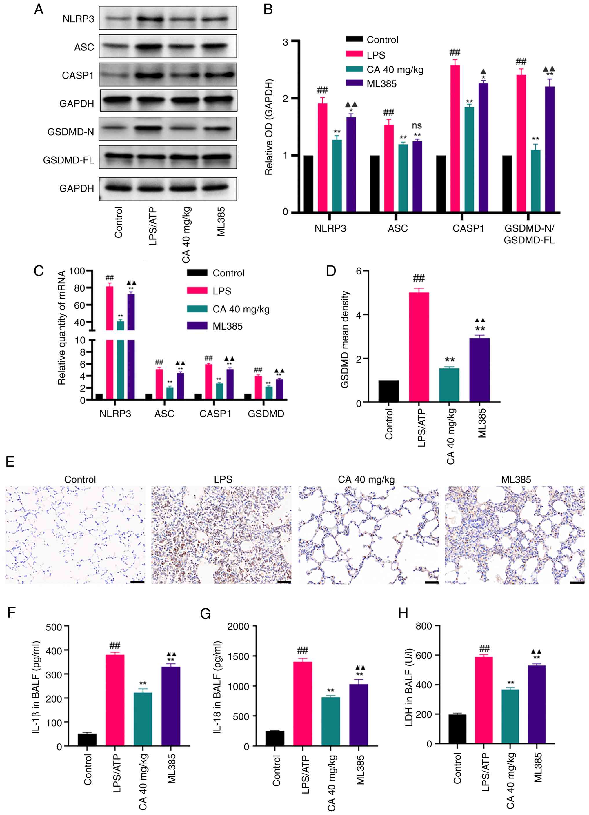 To explore whether the effects of CA were Nrf2-dependent, mice were pretreated with the Nrf2 inhibitor ML385. This pretreatment eliminated the ability of CA to downregulate NLRP3 inflammasome components and reduce inflammatory mediator release (Fig. 6A-H). Therefore, these findings suggested that CA could attenuate LPS-induced ARDS by suppressing NLRP3 inflammasome-mediated pyroptosis, a process partially dependent on Nrf2 activation.