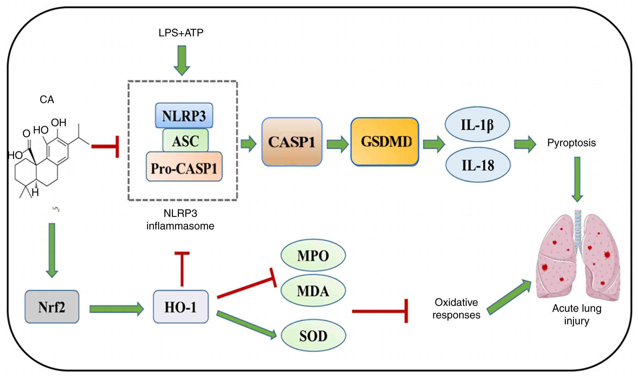 In recent years, natural products derived from medicinal plants have garnered significant attention as promising sources for drug discovery due to their multi-target activities and favorable safety profiles (4). Carnosic acid (CA), a phenolic diterpene abundantly found in rosemary (Rosmarinus officinalis Linnaeus) and sage, has been extensively documented for its potent anti-inflammatory, antioxidant and antimicrobial properties (5). Previous studies have demonstrated that CA can activate the nuclear factor erythroid 2-related factor 2 (Nrf2) pathway, a master regulator of cellular antioxidant responses. Upon activation, Nrf2 translocates to the nucleus and induces the expression of a battery of cytoprotective genes, including heme oxygenase-1 (HO-1), which collectively counteract oxidative stress (6,7). Furthermore, evidence suggests that Nrf2 activation can indirectly suppress the NLR family pyrin domain containing 3 (NLRP3) inflammasome, a key component of innate immunity whose hyperactivation drives pyroptosis, a highly inflammatory form of programmed cell death, through caspase-1-mediated cleavage of gasdermin D (GSDMD) and subsequent release of IL-1β and IL-18 (8,9). This Nrf2-NLRP3 axis has been implicated in various inflammatory diseases but remains relatively unexplored in the context of ARDS.