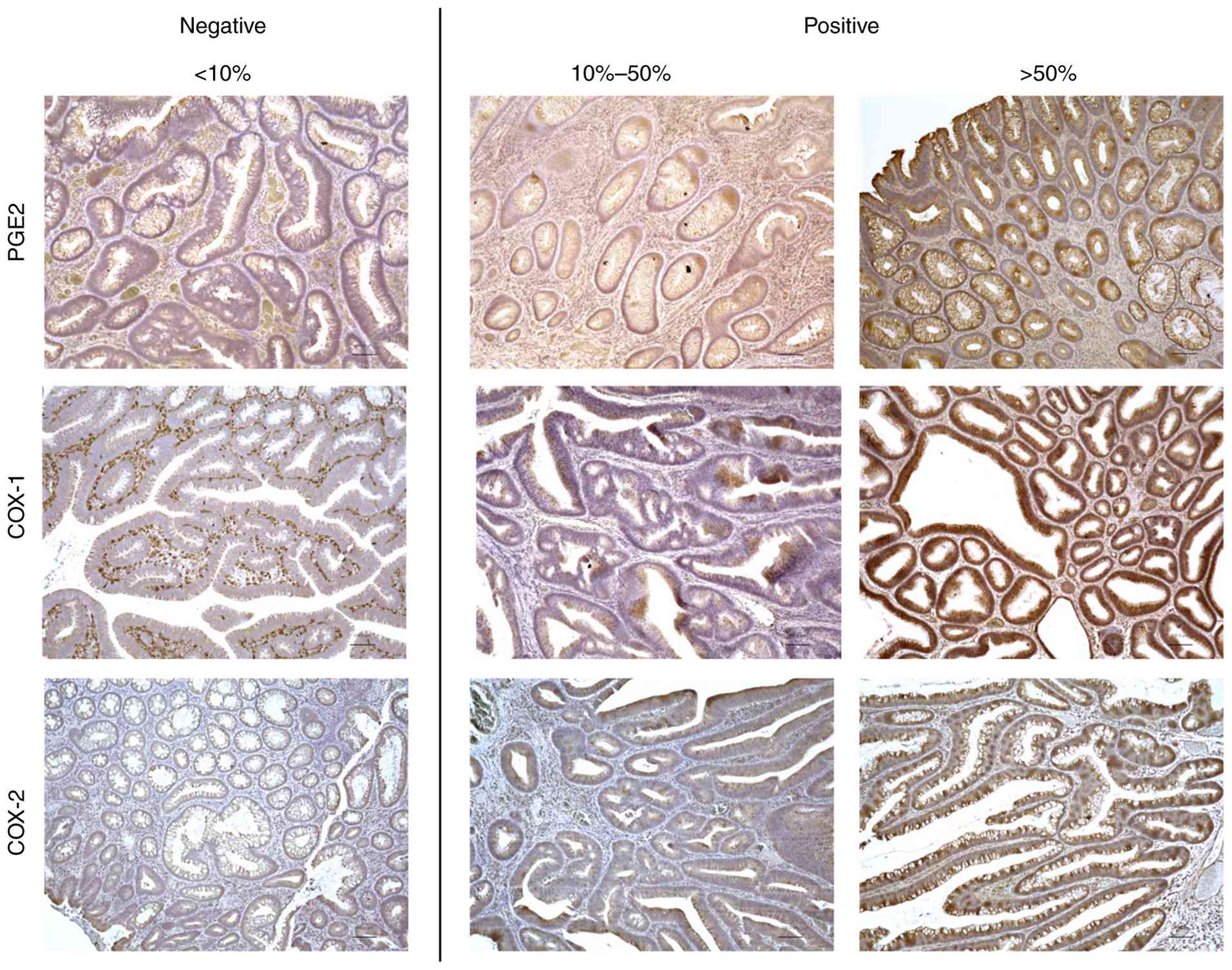 Immunohistochemical staining was performed using 3-µm FFPE sections. Antigen retrieval was carried out by heating the sections in citrate buffer (pH 6.0) in a pressure cooker for 15 min. The primary antibodies used were anti-PGE2 (ab2318, Abcam, Cambridge, UK; dilution 1:100), anti-COX-1 (ab109025, Abcam, Cambridge, UK; dilution 1:150), and anti-COX-2 (ab15191, Abcam, Cambridge, UK; dilution 1:100). Sections were incubated with primary antibodies overnight at 4˚C, followed by incubation with appropriate secondary antibodies (Vector Laboratories, Burlingame, CA, USA) and visualization using the ImmPACT DAB substrate kit (SK-4105, Vector Laboratories, Burlingame, CA, USA). Counterstaining was performed with hematoxylin. Negative controls were prepared by omitting the primary antibody. As no standardized or universally accepted cutoff for COX-1, COX-2, or PGE2 immunohistochemical positivity has been established in colorectal neoplasia, a threshold was determined a priori based on both morphological clarity and interobserver reproducibility. Immunostaining was evaluated manually, without the use of image-analysis software, by three independent investigators. The percentage positivity was estimated on an area basis by visually assessing the proportion of the glandular area exhibiting cytoplasmic or membranous staining within the entire adenomatous component. Glands were classified as positive when ≥10% of the glandular area exhibited cytoplasmic or membranous staining. Staining below this level was consistently interpreted as minimal and lacked biological significance. This threshold was supported by the high concordance of independent assessments performed by three investigators. For each case, at least 50 glands were evaluated to determine the percentage of positive glands.