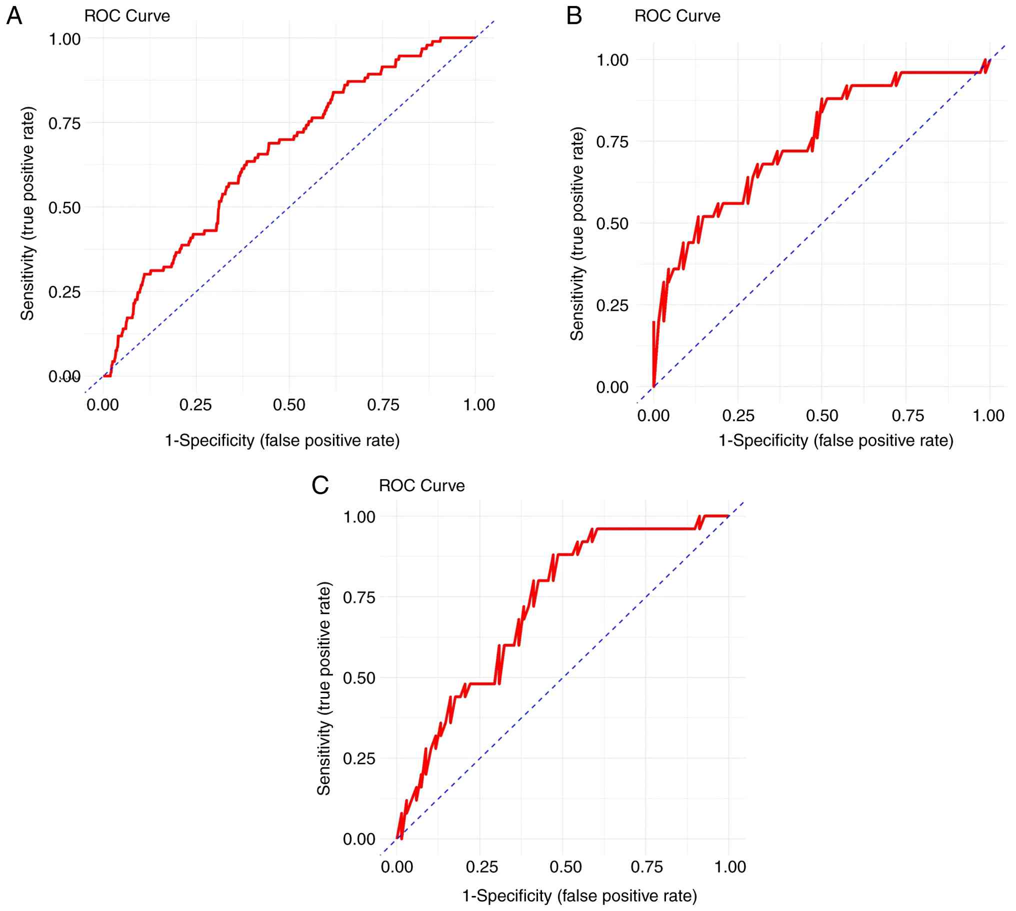 In summary, cTnI and LVEF were identified as independent prognostic factors for the occurrence and severity of heart failure. ROC curves were plotted, and the area under the curve (AUC) values for cTnI were 0.651, 0.753 and 0.711 for predicting mild, moderate and life-threatening heart failure respectively, with optimal thresholds of 0.044, 0.059 and 0.063 ng/ml, respectively. These findings indicated that when cTnI is <0.044 ng/ml, heart failure is not expected to occur; however, when cTnI is ≥0.044 ng/ml and <0.059 ng/ml, asymptomatic or mild heart failure is likely; when cTnI is ≥0.059 ng/ml and <0.063 ng/ml, moderate-to-severe heart failure is likely; and when cTnI is ≥0.063 ng/ml, life-threatening heart failure or death is expected (Fig. 1). For LVEF, the AUC values were 0.671, 0.724 and 0.749 for predicting mild, moderate and life-threatening heart failure respectively, with optimal thresholds of 39.083, 37.216 and 35.532%, respectively. These findings indicated that when LVEF is >39.083%, heart failure is not expected to occur; when LVEF is ≤39.083% and >37.216%, asymptomatic or mild heart failure is likely; when LVEF is ≤37.216% and >35.532%, moderate-to-severe heart failure is likely; and when LVEF is ≤35.532%, life-threatening heart failure or death is expected (Fig. 2).