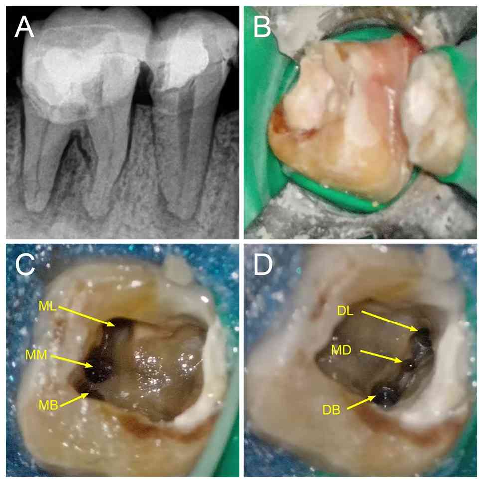 Hasan M, Rahman M and Saad N: Case Report: Mandibular first molar with six root canals: A rare entity. BMJ Case Rep. 2014(bcr2014205253)2014.PubMed/NCBI View Article : Google Scholar | |