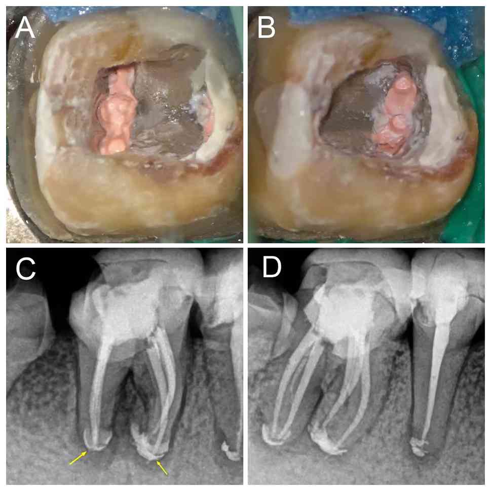 A 40-year-old Chinese female patient with no notable medical history presented to The Third People's Hospital of Chengdu (Chengdu, China) in November 2023 with chief complaints of pain in the lower right molar during mastication, persisting for 2 months. Additionally, the patient reported that the restoration on the same tooth had fractured 1 day earlier. The patient also recalled having undergone ‘endodontic treatment’ (July 2008) at the People's Hospital of Wenjiang District (Sichuan, China). This previous therapy involved partial pulp removal and mummification therapy on teeth nos. 45 and 46, followed by bridge restorations, which progressively deteriorated. Clinical examination revealed a notable fistula tract on the soft tissue surrounding tooth no. 46, which elicited slight pain and discharged pus upon palpation. The probing depth of the gingival sulcus was normal at all points except for the buccal intermediate of tooth no. 46, where a localized periodontal pocket measuring 7 mm was noted. Following the removal of the crown, tooth no. 46 displayed grade 1 mobility according to Miller's mobility index (21). Vertical percussion on the affected teeth caused noticeable pain and pulpal electro-vitality tests yielded no response. Periapical X-rays indicated high-density images in the crowns of teeth nos. 45 and 46, extending into the pulp cavity, with indistinct root canal images suggesting the presence of calcified canals. Additionally, diffuse radiolucent areas were observed in the apical regions of both teeth and the periodontal ligament space surrounding the cervical third and root bifurcation was widened (Fig. 1A). A dental cone-beam CT (CBCT) scan was recommended to improve understanding of the severity of the disease and the morphology of the root canal system. However, the patient declined this examination. Based on the clinical examination and radiographic findings, tooth no. 46 was diagnosed with chronic apical periodontitis. After being fully informed about their condition, the patient was given the option of non-surgical endodontic treatment or implant placement following extractions, with additional periodontal therapy potentially required. The patient opted for endodontic retreatment. Before beginning the treatment, the patient provided informed consent for all diagnostic and therapeutic procedures. Additionally, the Ethics Review Board of Chengdu Third People's Hospital (Sichuan, China) granted approval for the present report (approval no. 2025-S-83).