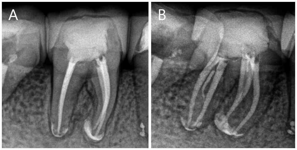 At the 10-day follow-up, the patient reported improvement, experiencing no discomfort in the affected tooth. Vertical percussion of tooth no. 46 elicited no pain and the sinus tract had resolved. The tooth was isolated with a rubber dam and the root canal was rinsed using 20 ml 3% NaClO and ultrasonic activation before being obturated with the ‘continuous wave of condensation’ technique (24) using gutta-percha and iRoot SP bioceramic sealer (Innovative BioCeramix, Inc.; Fig. 2A and B). The root canal orifices were sealed with Filtek™ Z350 XT flowable composite resin (3M ESPE; 3M Deutschland GmbH), and the crown was restored using Filtek™ P60 composite resin (3M ESPE; 3M Deutschland GmbH). Postoperative multi-angle radiographs confirmed the correct placement of the gutta-percha cones. Notably, some iRoot SP paste extruded from the apical foramen to ensure maximal sealing (Fig. 2C and D). After completing the root canal treatment, the patient was referred to the Department of Prosthodontics at Chengdu Third People's Hospital (Sichuan, China) for the fabrication of a full ceramic crown to protect tooth no. 46. At the 6 month follow-up (June 2024), the patient reported no discomfort with the treated tooth no. 46. Clinical examination revealed healthy surrounding gingiva without redness or swelling, a negative percussion response and normal periodontal probing depths. Furthermore, X-ray images exhibited a successful non-surgical root canal treatment, with a visible decrease in the dark shadow surrounding the furcation and root apex. A residual high-density radiopaque area corresponding to the extruded sealer was observed (Fig. 3). At 24 month follow-up in November 2025, the patient remained asymptomatic. Multi-angle radiographic evaluation revealed complete resolution of the periapical and furcation radiolucencies, with a decrease in the extent of the extraradicular high-density area (Fig. 4A and B). Thus, continuous follow-up every 6-12 months with the patient is important; if the patient experiences unresolved periapical inflammation or recurrent discomfort, apical surgery may be considered.