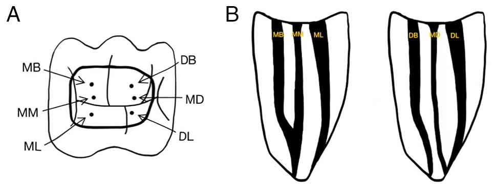 Gupta S, Jaiswal S and Arora R: Endodontic management of permanent mandibular left first molar with six root canals. Contemp Clin Dent. 3 (Suppl 1):S130–S133. 2012.PubMed/NCBI View Article : Google Scholar | |