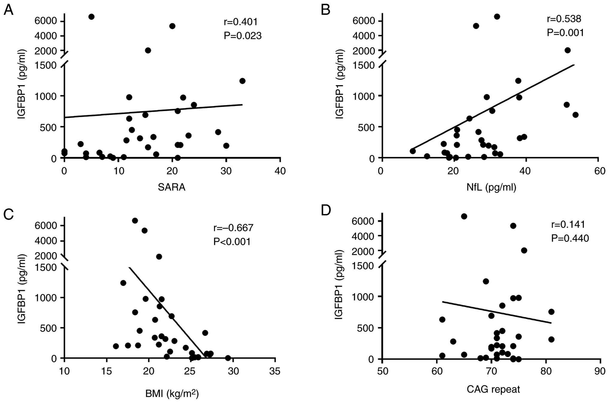 In the SCA3 cohort, Spearman's correlation analysis revealed that IGFBP1 levels were positively correlated with SARA scores (r=0.401; P=0.023) and NfL (r=0.538; P=0.001), and negatively correlated with BMI (r=-0.667; P<0.001). No significant association with CAG repeat length was observed (r=0.141; P=0.440) (Fig. 2). Although several higher IGFBP1 values were present, all measurements were deemed physiologically plausible and therefore no data points were excluded from the analysis.