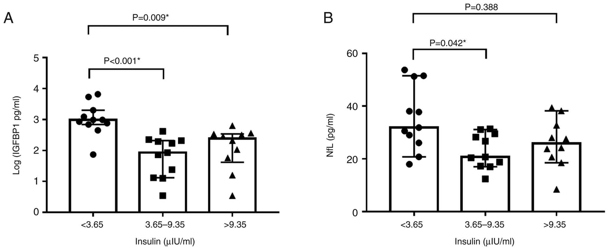 To further investigate the interplay between insulin signaling and neurodegenerative markers, patients with SCA3 were stratified into tertiles based on baseline plasma insulin levels. Log-transformed IGFBP1 levels differed significantly among insulin tertiles (Kruskal-Wallis test, P<0.001). Dunn's post hoc test revealed that patients in the lowest insulin tertile had significantly higher IGFBP1 levels than those in the middle (P<0.001) and highest tertiles (P=0.009), whereas no significant difference was observed between the middle and highest tertiles. Similarly, NfL levels also differed among insulin tertiles (P=0.046), with higher levels in the lowest vs. middle tertile (P=0.042), but no significant difference vs. the highest tertile (P=0.388; Fig. 3A and B). These findings suggested that insulin insufficiency could be associated with increased IGFBP1 expression and greater neuroaxonal damage. Notably, insulin concentrations were lowest in the tertile with the highest IGFBP1 and NfL levels, further supporting an inverse association between insulin signaling and neurodegenerative indicators. However, the association between insulin tertiles and IGFBP1 or NfL was not attributed to differences in ataxia severity or genetic factors, as SARA scores, age at onset and CAG repeat numbers were comparable across insulin tertiles (all P>0.05, Fig. S1).