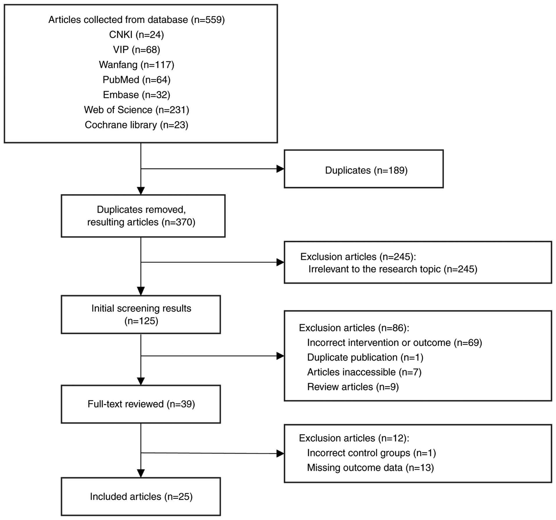 A total of 559 relevant papers were retrieved from the present literature search and 39 papers were finally assessed in full text. Among the 39 included literature, 13 studies with missing data and 1 study with a wrong intervention were further excluded, leaving 25 studies that met the present study inclusion criteria retained for meta-analysis (Fig. 1). Among them, 6 studies were NRCTs and 19 studies were RCTs.