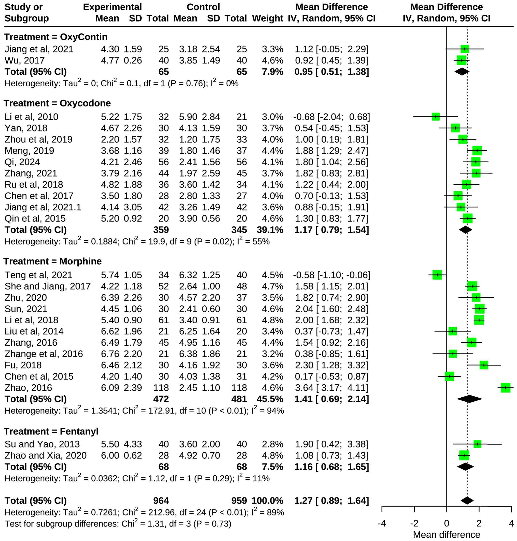 Subgroup analysis excluding morphine. Due to the high heterogeneity observed in the morphine subgroup, a sensitivity analysis was conducted excluding morphine studies (Fig. S4). The pooled MD was 1.17 (95% CI, 0.92-1.42; P=0.0449; I2=42.8%), showing that after removing morphine studies, the overall heterogeneity notably decreased from 88.7 to 42.8%, while maintaining statistical significance. This suggests that differences in morphine studies contribute markedly to the overall heterogeneity.