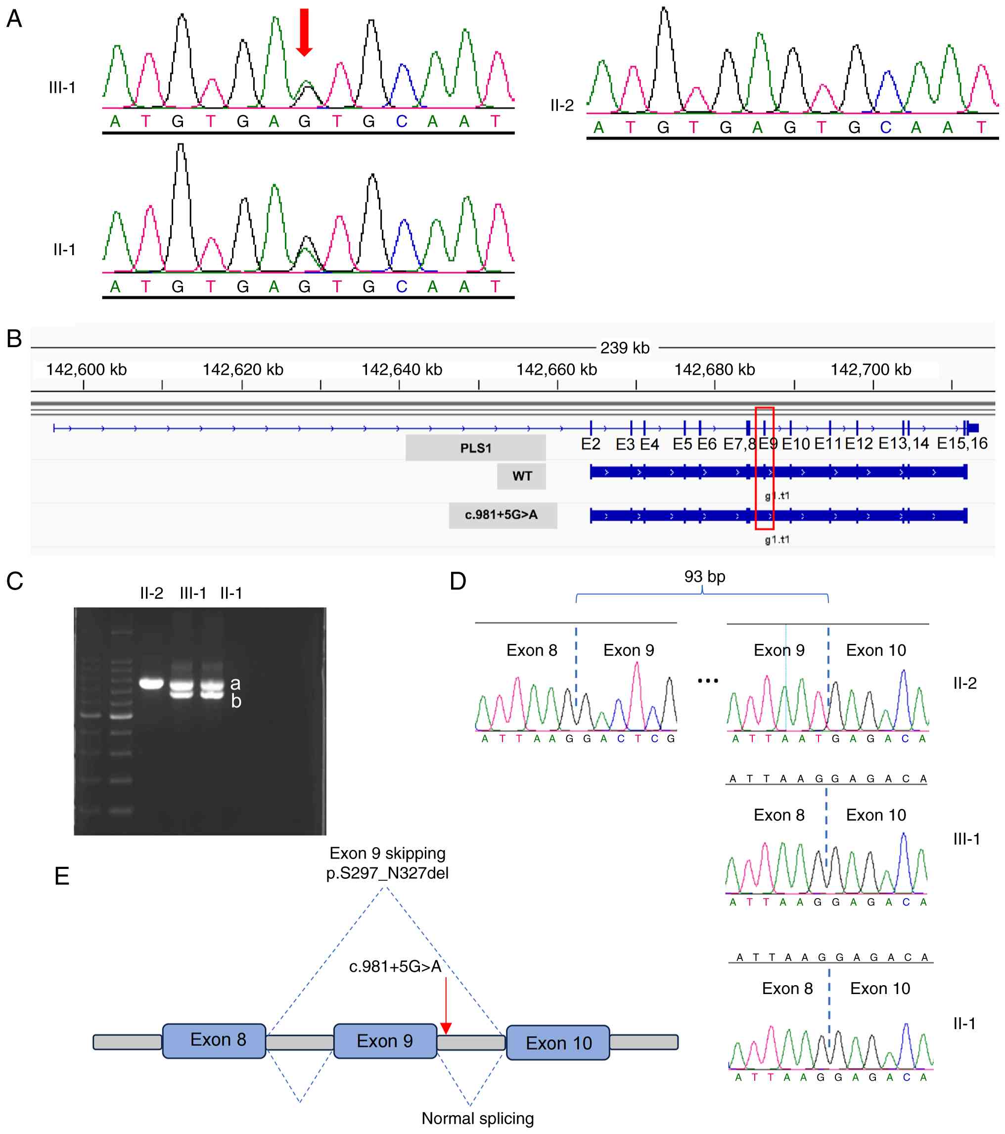 The PLS1 c.981+5G>A variant is located near a splicing site. Therefore, using the AUGUSTUS program, this mutation was predicted to cause the skipping of exon 9 (Fig. 2B). To validate this, total RNA was extracted from the lymphocytes of all patients, including the control (the father) and fragments were analyzed through reverse transcription PCR and agarose gel electrophoresis. In addition to the normal band, the proband and her affected mother exhibited an unexpected, lower band that was absent in the control (Fig. 2C). Sanger sequencing demonstrated that this extra band corresponded to a transcript lacking the entire exon 9 (Fig. 2D). These findings demonstrate that the PLS1 c.981+5G>A mutation causes exon 9 skipping, generating an aberrant splicing product.