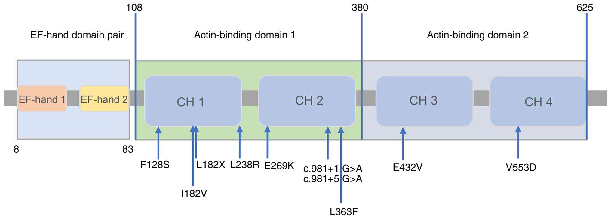 PLS1 encodes plastin-1 (also known as fimbrin), a 629-amino acid protein containing two EF-hand domains and two actin-binding domains (ABD1 and ABD2), each composed of CH domains (27). Reported cases of hearing loss due to PLS1 mutations are scarce. To the best of our knowledge, including the present study, only 12 families with NSHL caused by PLS1 mutations have been described (12-15), eight of which are from Europe. The remaining three originate from Asia, two of which belong to the Han Chinese population. While this may suggest a higher incidence in Europe, more data is needed to validate this. To date, 10 PLS1 mutations causing autosomal dominant deafness have been identified, including seven missenses, two splice sites and one frameshift. Notably, both reported splicing mutations were identified in Chinese families. As summarized in Fig. 4, the majority of variants are located within the CH domains of ABD1. PLS1 crosslinks actin filaments by using its two ABDs to recruit and bind ACTB molecules on opposite faces (28). Therefore, structural defects in ABD1 or ABD2, whether caused by missense or splicing variants, likely impair actin binding, ultimately disrupting stereocilia formation and causing hearing loss.