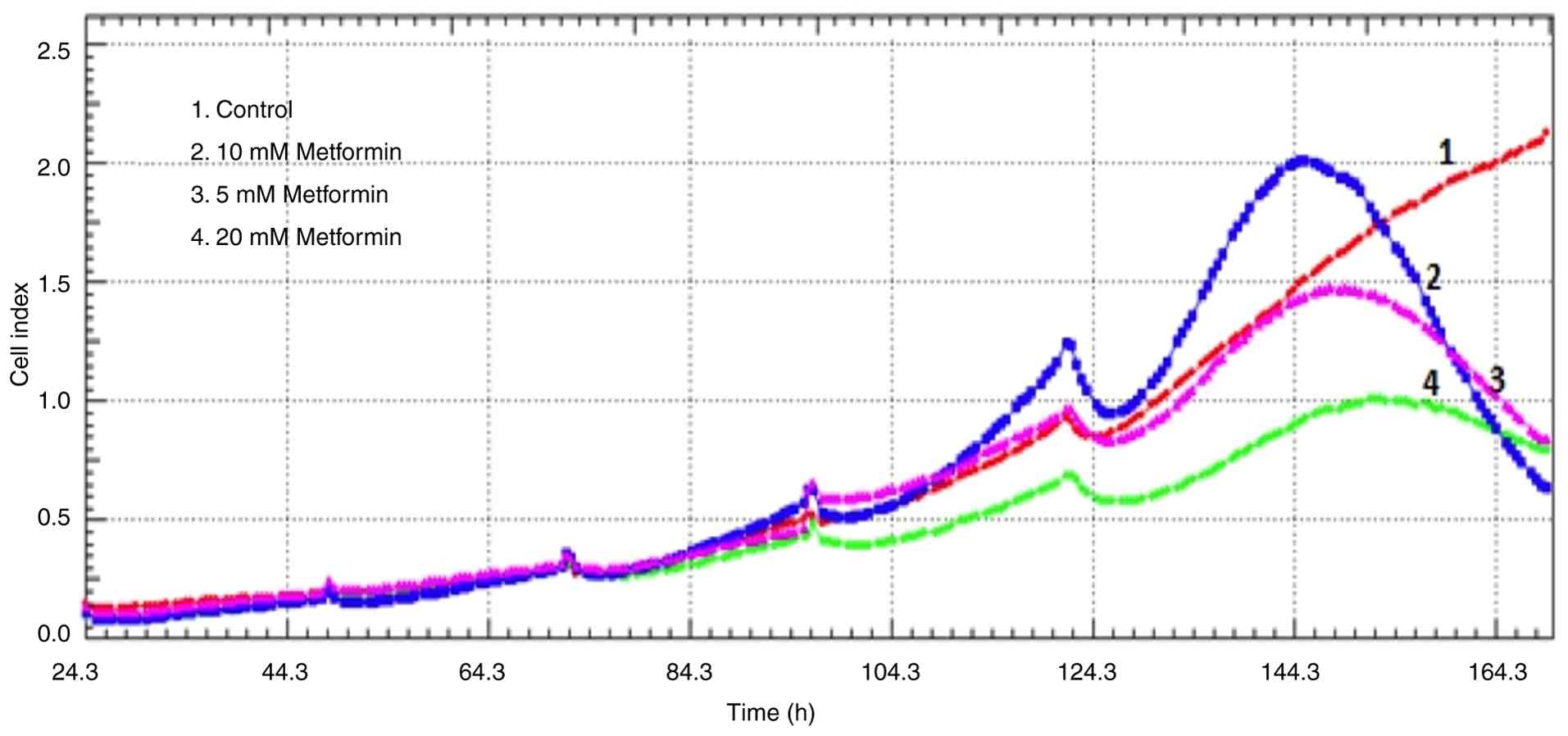 RTCA operates based on electronic impedance readings obtained from sensor electrodes located beneath e-plates. As cells attach to or detach from the surface electrodes, the change in electronic impedance is mathematically expressed as cell index (CI) values (30). Cells were cultured in plates designed for the xCELLigence Real-Time Cell Analysis system (Agilent Technologies, Inc.) at 5x103 cells/well and incubated with 5% CO2 for 24 h at 37˚C. Furthermore, the medium containing metformin (cat. no. D15095-9; Sigma-Aldrich; Merck KGaA; 5, 10 and 20 mM) was added to different wells. Complete medium without metformin was added to the control wells. The e-plates were monitored for 6 days.