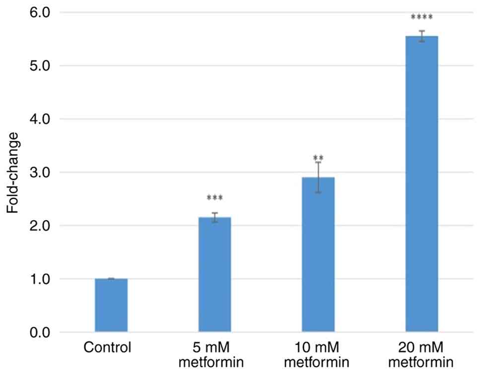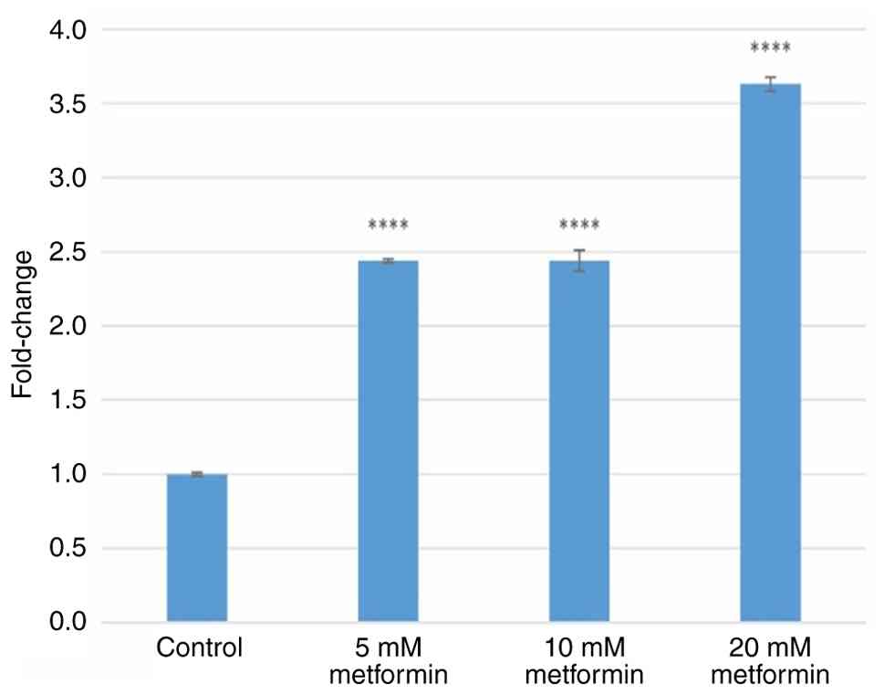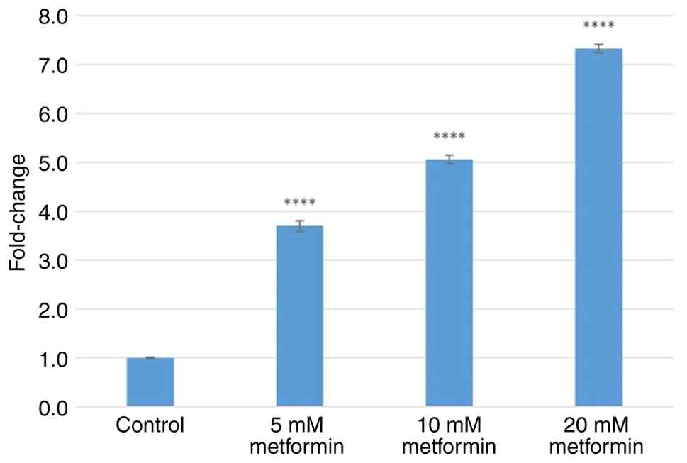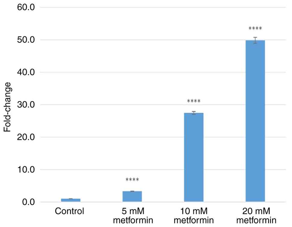 Treatment with 5, 10 and 20 mM metformin increased GRP78 gene expression by 3.70±0.11-, 5.06±0.08- and 7.33±0.08-fold (all P<0.0001), respectively (Fig. 2). Treatment with 5, 10 and 20 mM metformin increased PERK gene expression by 2.48±0.09-, 4.36±0.06- and 9.11±0.36-fold (all P<0.0001), respectively (Fig. 3). Treatment with 5, 10 and 20 mM metformin increased IRE1 gene expression levels by 2.15±0.08- (P=0.001), 2.90±0.03- (P<0.001) and 5.55±0.10-fold (P<0.0001), respectively (Fig. 4). Treatment with 5, 10 and 20 mM metformin increased ATF6 gene expression levels by 2.43±0.01-, 2.44±0.07- and 3.63±0.05-fold (all P<0.0001), respectively (Fig. 5). Treatment with 5, 10 and 20 mM metformin increased CHOP gene expression levels by 3.31±0.06-, 27.47±0.44- and 49.85±0.9-fold (all P<0.0001), respectively (Fig. 6).