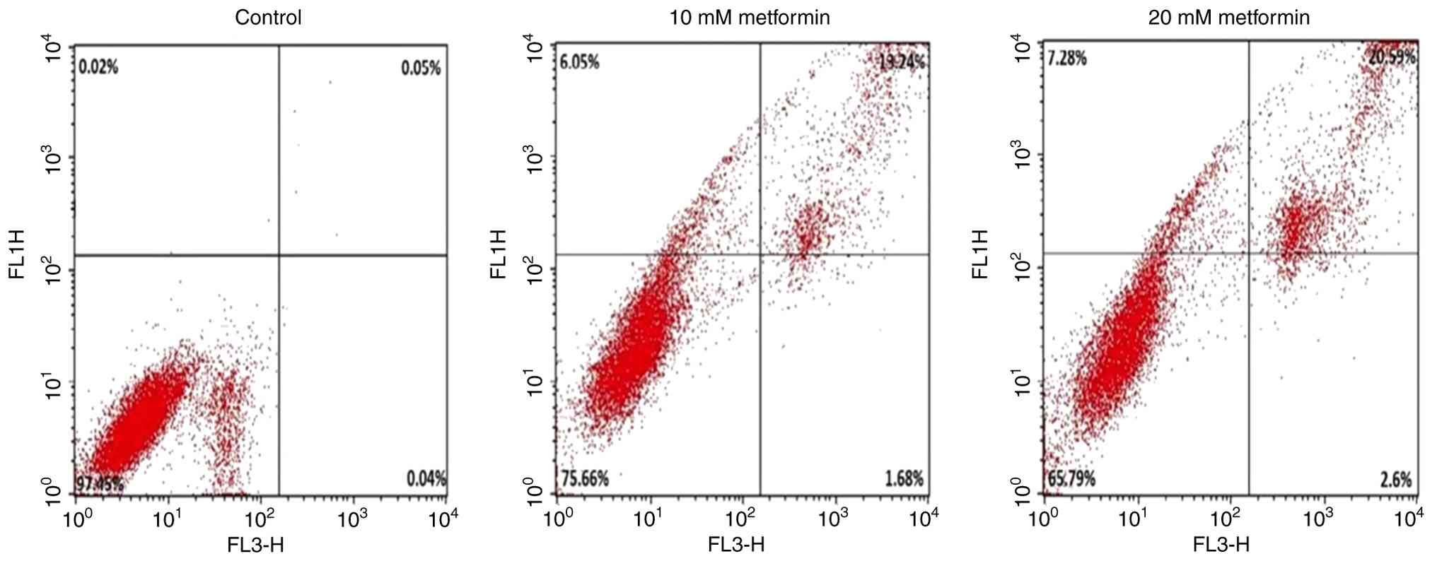 Early and late apoptotic cell populations were detected using an Annexin V-FITC/PI apoptosis detection kit (cat. no. E-CK-A211; Elabscience Bionovation Inc.), according to the manufacturer's protocol. Following 24 h metformin treatment as aforementioned, cells were harvested by trypsinization, washed in PBS and stained for apoptosis analysis using an Annexin V-FITC/PI assay. The staining procedure was performed as follows: Cells were resuspended at a density of 5x105 cells per sample in 500 µl of 1X Annexin V Binding Buffer. Each sample was then stained by adding 5 µl of Annexin V-FITC conjugate and 5 µl of PI directly to the cell suspension. The mixture was gently vortexed and then incubated at room temperature (~25˚C) in the dark for 15-20 min. After the incubation,cells were analyzed immediately by flow cytometry (BD FACSCalibur™; BD Biosciences) using the BD CellQuest™ acquisition and analysis software (version 5.2.1; BD Biosciences).