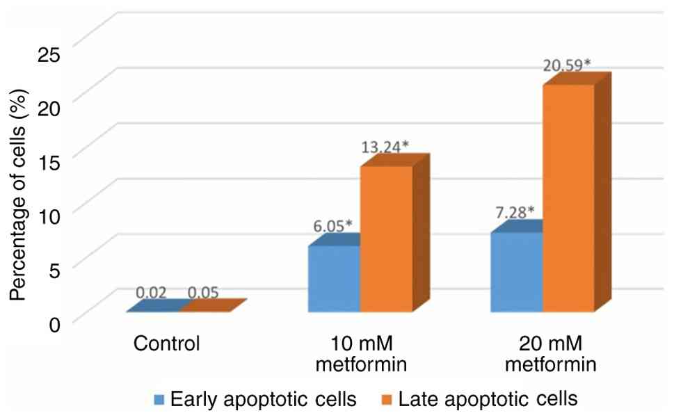 Treatment with 10 and 20 mM metformin significantly increased early apoptotic cells to 6.05 and 7.28, as well as late apoptotic cells to 13.24 and 20.59% (all P<0.001), respectively, compared with the control group (Fig. 7). These results demonstrated dose-dependent induction of apoptosis (Fig. 8).