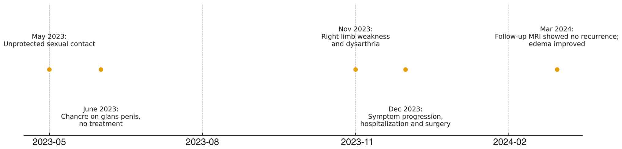 A 60-year-old man with a 6-month history of syphilis was admitted to to Jiangnan University Medical Center (Wuxi, China) in December 2023 for progressive right-sided limb weakness and slurred speech over a 2-week period. On admission, the patient presented with complete right-sided hemiplegia. The patient's medical history was unremarkable, with no hypertension, diabetes or other chronic illnesses, and the patient was not taking any regular medications and denied any substance abuse. There was no family history of sexually transmitted infections or related conditions.