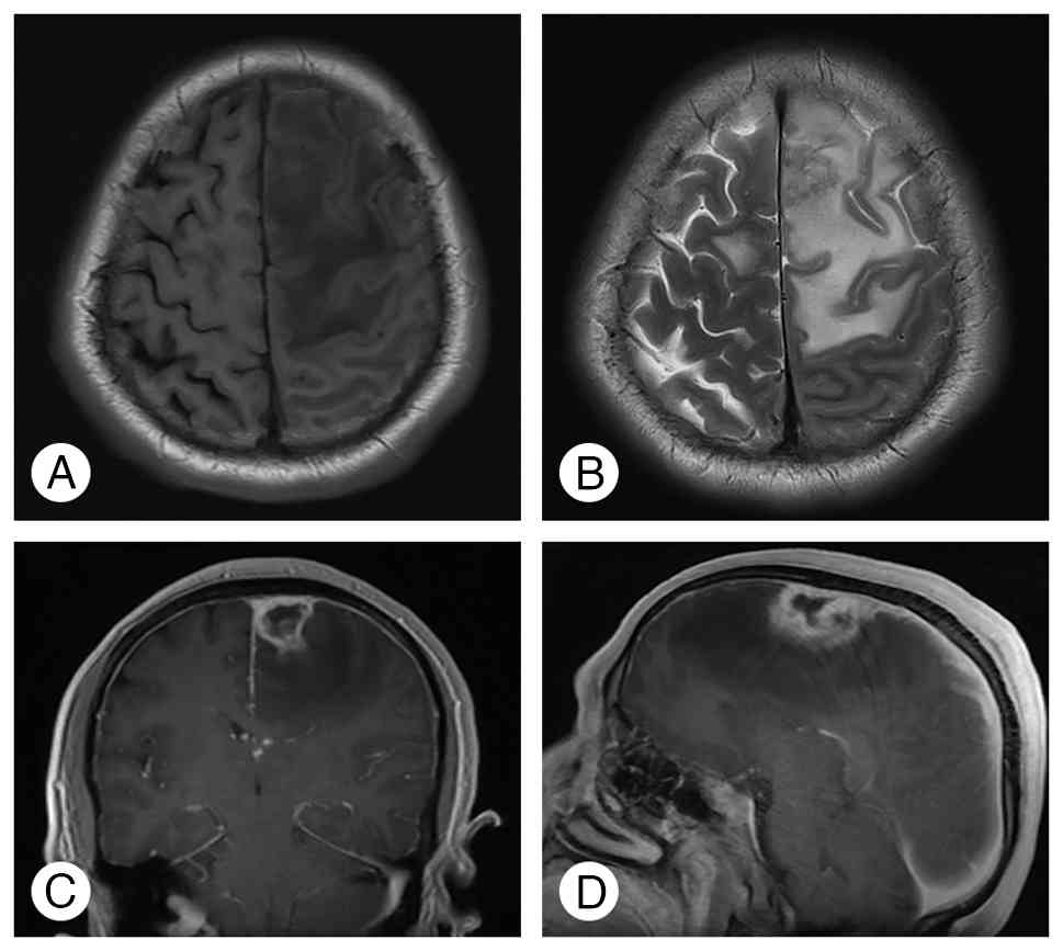 Syphilis is a sexually transmitted infection caused by the spirochete Treponema pallidum (1,2). Despite its long history, syphilis continues to pose a notable public health challenge due to its ability to mimic a wide array of clinical conditions. Neurosyphilis (NS), a severe complication resulting from the invasion of Treponema pallidum into the central nervous system, can occur at any stage of syphilis. Historically, up to ~30% of untreated patients with syphilis developed NS; however, with antibiotic treatment, symptomatic NS is now estimated to occur in 1.5-13% of syphilis cases, and cohort data indicate that, among individuals with human immunodeficiency virus (HIV) infection, the incidence of NS is twice that of those without HIV infection (3,4). Cerebral syphilitic gummata (CSG) are rare manifestations typically associated with tertiary syphilis (5). In Cushing's (6) frequently cited case series of 2,203 intracranial tumors published in 1932, only 12 cases (0.5%) were identified as CSG. In a review of intracranial tumors by Grant (7) in 1956, which included 2,326 patients, only 5 cases (0.2%) were diagnosed as CSG. Likewise, Katsura et al (8), in a review of all neurosurgical cases in Japan prior to 1959, identified only 12 cases of syphilitic gummas among 3,312 patients, yielding an incidence of 0.4%. Although large-scale retrospective studies from recent years are lacking, the limited number of sporadic case reports published over the past two decades suggests that CSG has become an even rarer disease entity. The gummata are granulomatous lesions that may develop in various organs, including the brain, as a consequence of a chronic inflammatory response to persistent infection (9). Within the central nervous system, these lesions can give rise to diverse neurological symptoms depending on lesion size and location, including headaches, seizures, focal neurological deficits, cognitive impairment and behavioral disturbances. Owing to their rarity and heterogeneous presentation, CSG are frequently misdiagnosed or mistaken for other conditions, such as neoplasms, abscesses or other infectious or inflammatory disorders (10). The present study reports a case of CSG in a 60-year-old male patient who rapidly developed hemiplegia of the right upper and lower limbs over several days. The present case underscores the importance of considering NS in patients presenting with atypical neurological symptoms, particularly those with risk factors for syphilis infection.