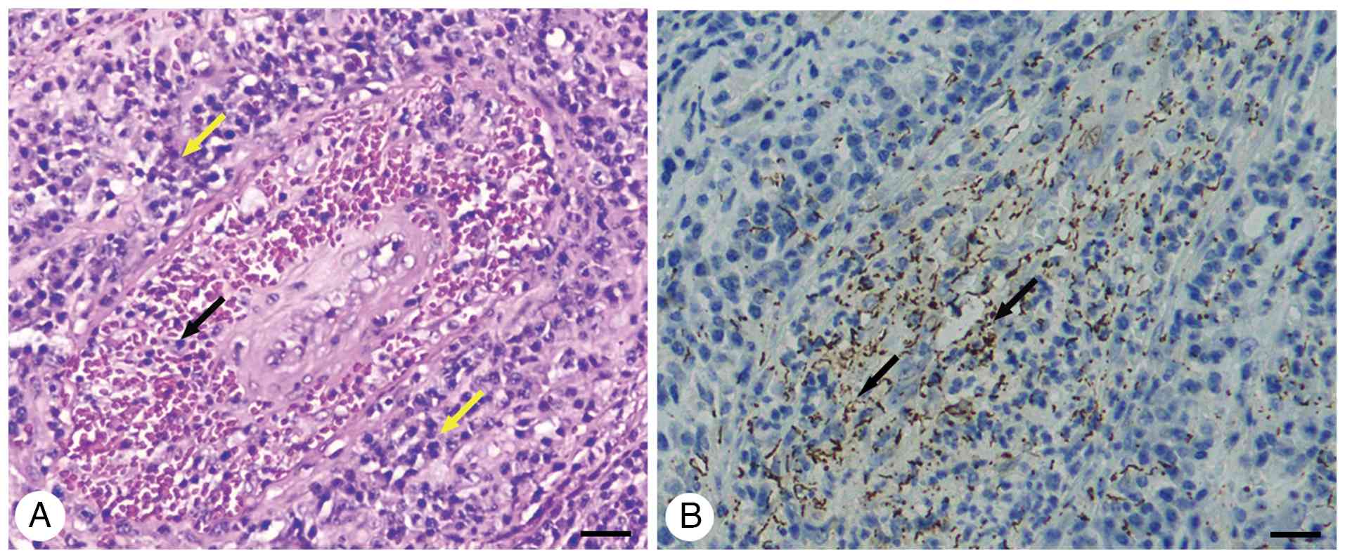 For immunohistochemical analysis, the resected tissue was fixed in 10% neutral buffered formalin at room temperature for 24 h, paraffin-embedded and sectioned at a thickness of 4 µm. Sections were deparaffinized in xylene and rehydrated through a descending ethanol series (100, 95, 85 and 75%), followed by rinsing in PBS (41404ES76; Shanghai Yeasen Biotechnology Co., Ltd.). Antigen retrieval was performed by heating the sections in citrate buffer (pH 6.0) at 95-100˚C for 15 min. Endogenous peroxidase activity was quenched by incubation with 3% hydrogen peroxide. The sections were permeabilized with 0.1% Triton X-100 and blocked with 5% normal goat serum (36119ES10; Shanghai Yeasen Biotechnology Co., Ltd.) at room temperature for 30 min. Sections were incubated overnight at 4˚C with a commercially available imported primary antibody against Treponema pallidum (dilution, 1:200; ZA-0199; Beijing Zhongshan Jinqiao Biotechnology Co., Ltd.). After washing with PBS (41404ES76; Shanghai Yeasen Biotechnology Co., Ltd.), an HRP-conjugated goat anti-rabbit secondary antibody (dilution, 1:500; ab6721; Abcam) was applied at room temperature for 30 min. Chromogenic detection was performed using 3,3'-diaminobenzidine. Immunostained sections were examined and imaged using a light microscope at magnifications of x200 and x400. Immunohistochemical staining with anti-syphilis spirochetes antibodies revealed numerous brown spirochetes (Fig. 4A and B).