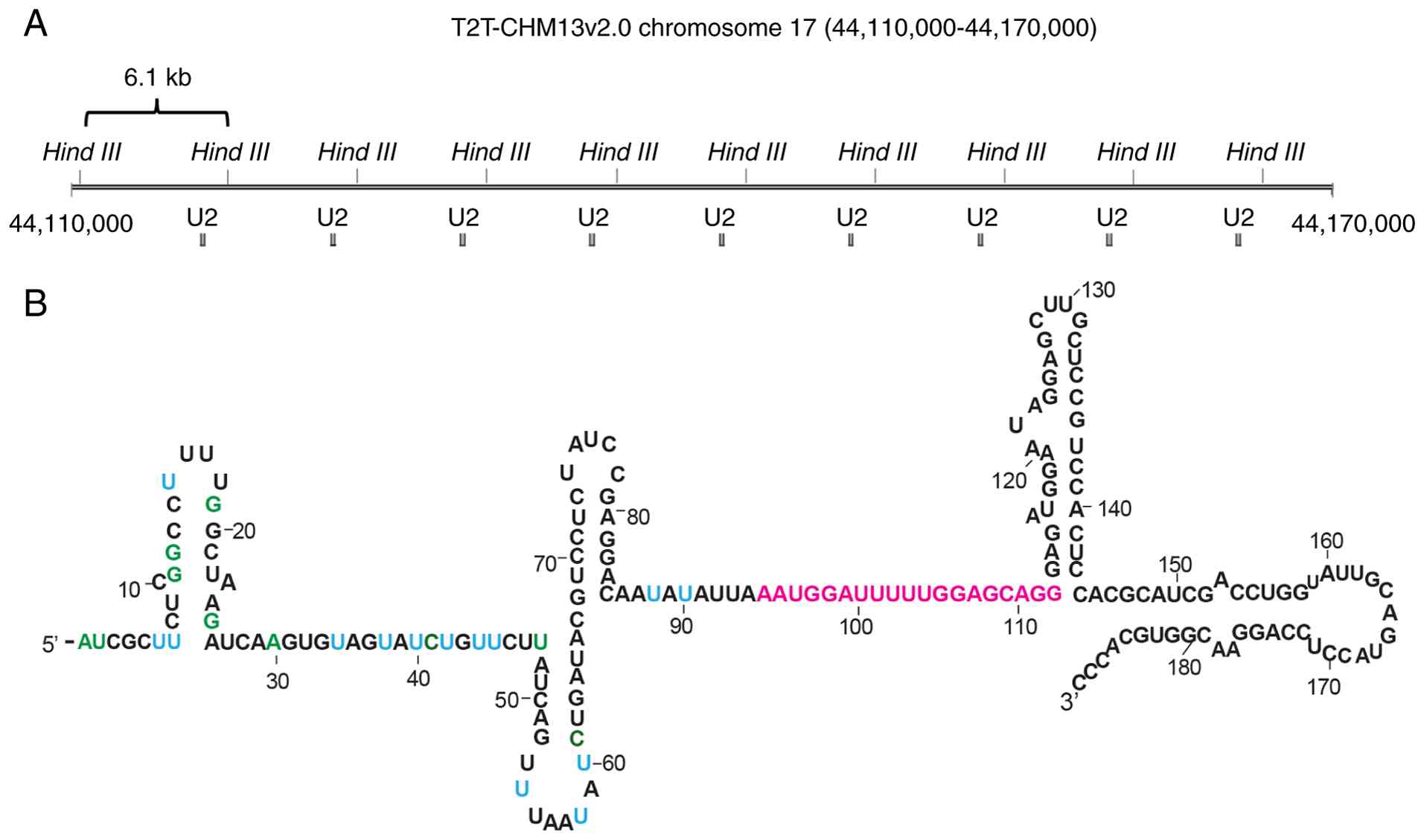 RNU2-1 is located on human chromosome 17q21.31, and is organized as a tandem array (15,16). A 6.1 kb repeat unit includes a188 bp U2 snRNA coding region, and the repeat number of the unit exhibits certain polymorphisms [i.e., copy number variations (CNVs)] (17) (Fig. 1A). The identified copy number range was 6-82 per haploid genome, as determined through direct visualization of the polymorphic RNU2-1 gene copy number using fluorescence in situ hybridization (FISH) on 46 unrelated chromosomes (18). In addition, 53 alleles were identified via Southern blot analysis (19).