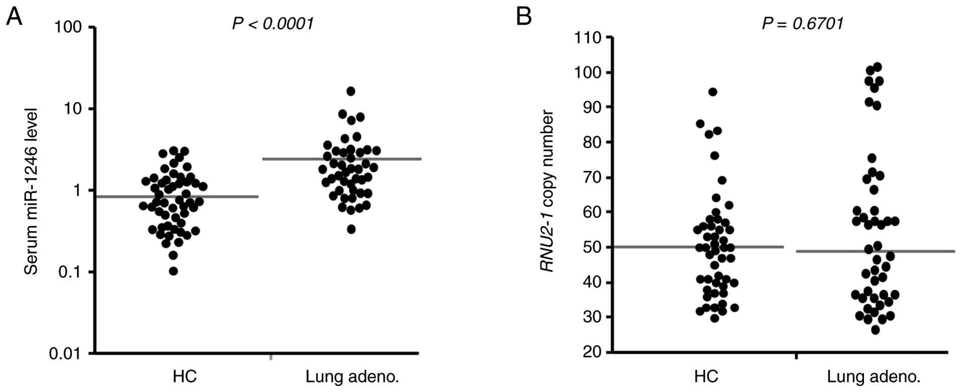 In this study, we investigated whether polymorphisms in RNU2-1 copy number affect serum miR-1246 levels in patients with stage IV lung adenocarcinoma and healthy individuals. First, we confirmed that serum miR-1246 levels were significantly higher in patients with stage IV lung adenocarcinoma than in healthy individuals, as has been reported previously (8,12,21). We then analyzed the RNU2-1 copy number per diploid genome using dPCR with DNA derived from peripheral blood samples. The median RNU2-1 copy numbers in HC and patients with stage IV lung adenocarcinoma were 50 and 49, respectively, with no significant difference being observed between them. We also did not identify any correlation between RNU2-1 copy number and serum miR-1246 level in either group. These results suggest that RNU2-1 CNVs have no effect on serum levels of the lung adenocarcinoma biomarker miR-1246. Other studies have previously investigated correlations between gene copy numbers and serum levels of the corresponding gene products, for some other genes. Serum amylase levels, for example, were not found to correlate with AMY2 or AMY2B copy numbers (range: 1-4), but did correlate with that of AMY1A (range: 2-27) (23). A correlation was also demonstrated between the copy numbers of the FCGR3B gene (range: 0-3) and serum levels of Fc gamma receptor III-B (FCGR3B) (24). The RNU2-1 copy numbers, which range from 26 to 101, had no effect on serum miR-1246 levels in both healthy individuals and patients with lung adenocarcinoma.