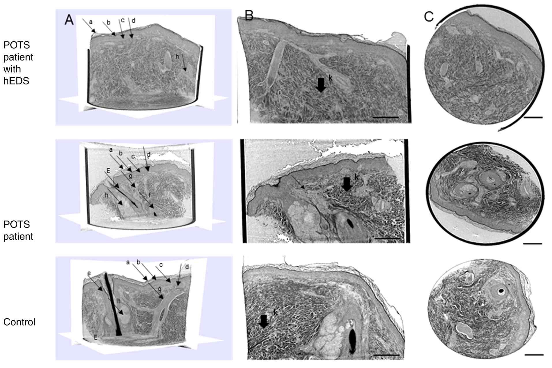 Within the present study, the main findings indicated that the structures of the different layers in the skin could be visualized by 3D virtual histology using X-ray phase-contrast micro-CT. No intraepidermal nerve fibers could be visualized. The percentage of disorganized collagen fiber bundles was similar between healthy controls and patients with POTS but different in POTS with hEDS/EDS and the percentage of disorganized fibers in patients with concomitant hEDS/EDS differed from that in patients with only POTS. Furthermore, the proportion of participants with any disorganized collagen bundles and parallel bundles throughout the biopsy differed within both patient groups but not within the control group. However, a number of clinical differences were observed between participants with parallel and disorganized collagen fiber bundles.