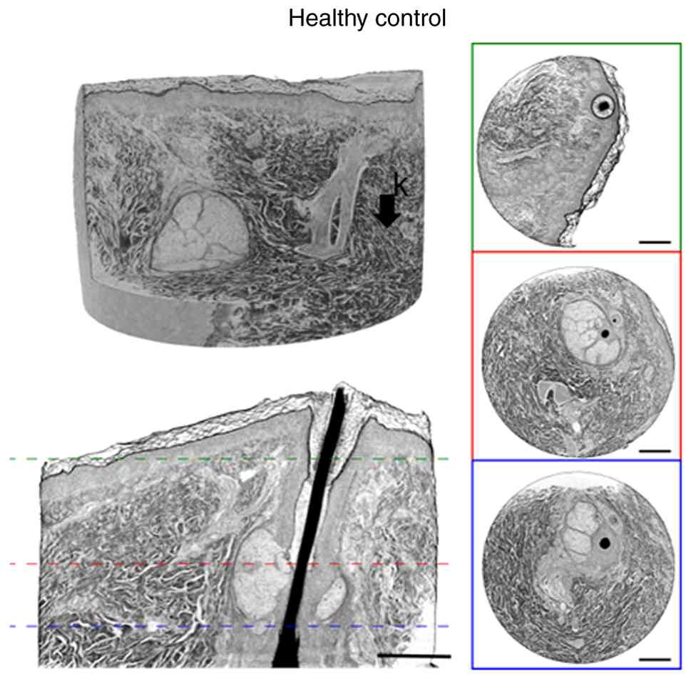 Micro-CT has recently been described as a complementary tool for histopathological diagnosis of oral soft tissue (30,31). To the best of our knowledge, since the present study was the first to describe skin biopsy analysis using this technique and a large dataset of 50 participants was evaluated, it is important to consider how the technique may be used in the future. Notably, a promising future application of this technique for skin examination could be to determine infiltration and the radicality of surgery in basal cell carcinoma and to be able to separate different types of alopecia. The current 3D virtual histology using X-rays is an alternative option to evaluate the radicality of surgery in whole tissues, scanned from the bottom of the resected tissue. Scalp biopsy is currently the most reliable diagnostic technique to diagnose and classify different types of alopecia (32). Micro-CT is an alternative to multiple sectioning, offering a 3D view of the whole hair follicle and surrounding tissue.