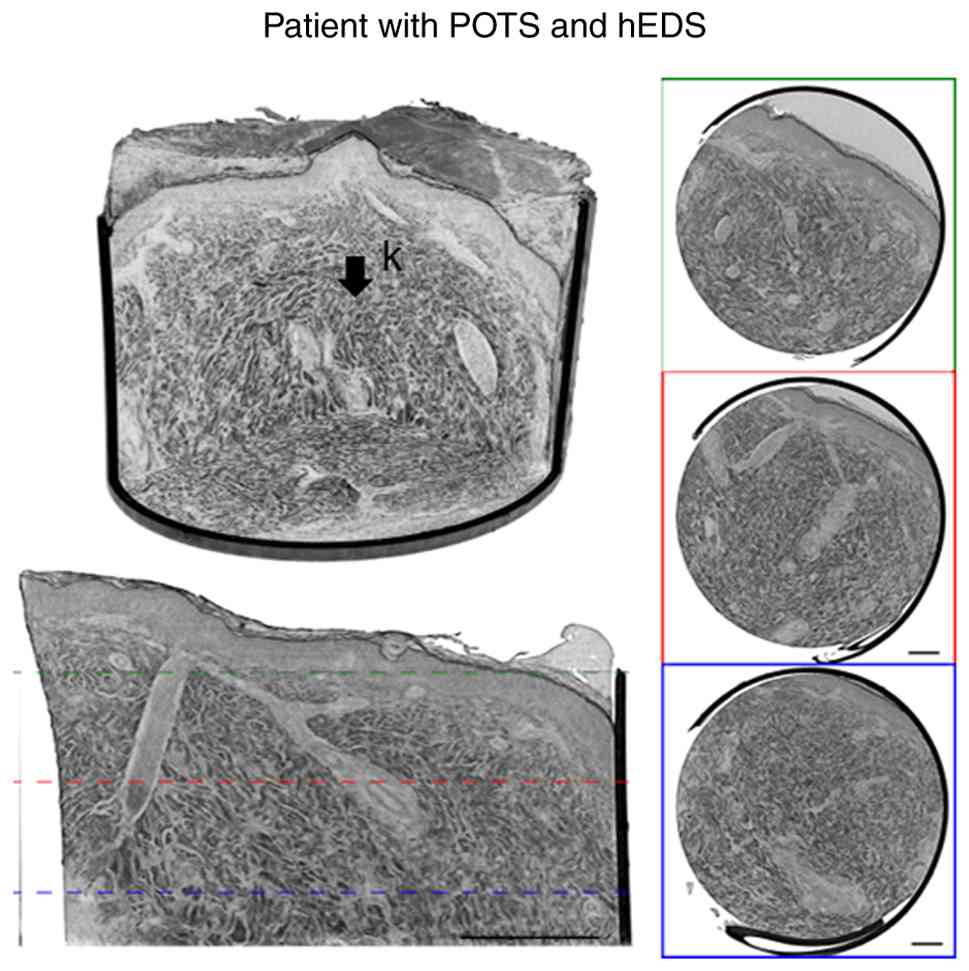 Gastrointestinal symptoms in POTS and HSD/hEDS occur frequently, both as functional gastrointestinal disorders and as more severe intestinal dysmotility disorders (10-12). Dysmotility may be due to pathology in the nervous system, muscles and/or connective tissue, (13) and diagnosing severe gastrointestinal dysmotility is challenging, as gastrointestinal motility varies widely among healthy individuals, with full-thickness bowel biopsies only occasionally being performed (11,14). Neuropathy is often generalized (15) and thus, biopsy sampling for diagnostic purposes should be prioritized in easily accessible organs, such as the skin. Our previous studies have reported that phase-contrast tomographic imaging with 3D illustration could reveal disorganized dermal collagen fiber bundles in a patient with POTS and hEDS and severe intestinal dysmotility, who also exhibited a reduced intraepidermal nerve fiber density (16,17). An additional patient with dysmotility exhibited an increased amount of inter-fibrillar ground substance (17). Notably, Histomography® GmbH has developed a laboratory-based micro-CT system, specifically optimized for paraffin-embedded biopsy cores. This technique enables detailed 3D structural analysis of soft tissue samples (18,19).
