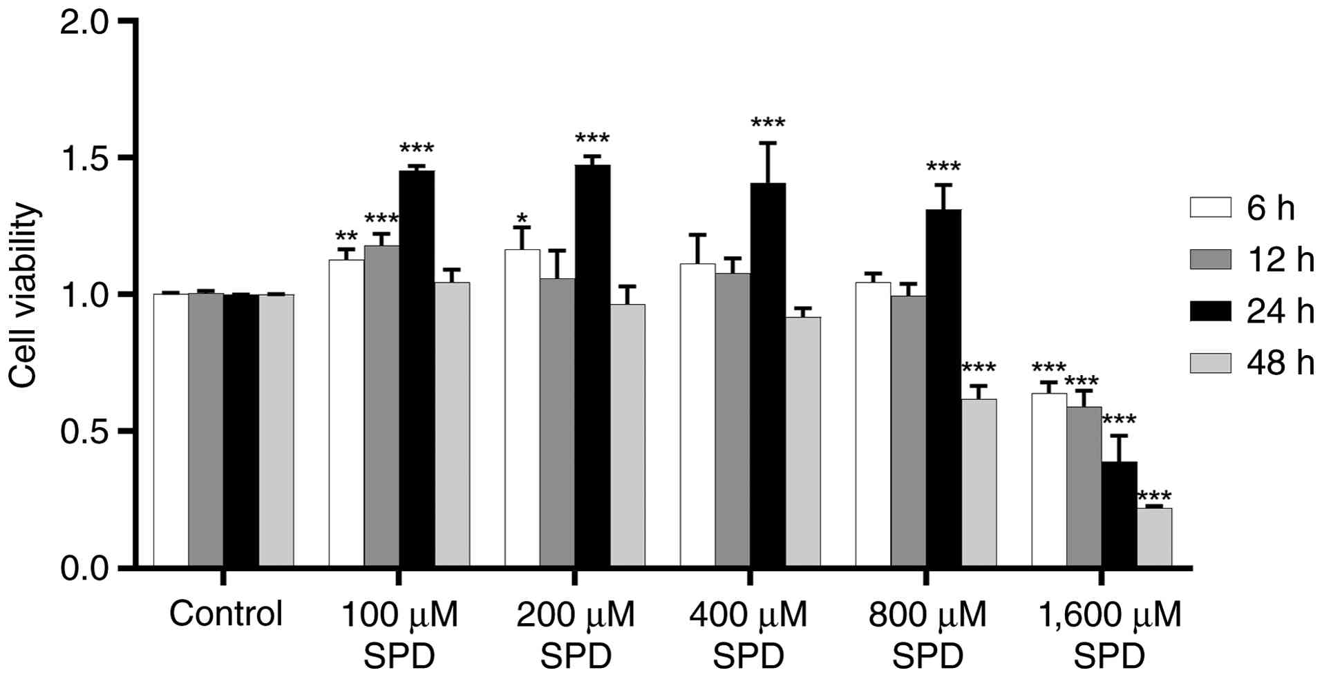 To evaluate whether SPD treatment induced cytotoxicity, cells were incubated with different concentrations of SPD for 6, 12, 24 and 48 h. As shown in Fig. 1, treatment with 100 and 200 µM SPD for 6 h significantly enhanced RAW 264.7 cell viability (P<0.05). After 12 h of treatment, only 100 µM SPD significantly increased cell viability (P<0.001). After 24 h of 0-800 µM SPD treatment, RAW 264.7 macrophage viability increased significantly (P<0.001), however the difference in cell viability between different concentration subgroups (200, 400, 600 and 800 µM) was not significant (P>0.05). Treatment with 1,600 µM SPD induced cytotoxicity compared with that of the control group (DMEM) (P<0.001). After 48 h of treatment, none of the SPD concentrations improved cell viability. Therefore, SPD concentrations of 0-800 µM and a 24 h treatment duration were chosen for subsequent experimentation.