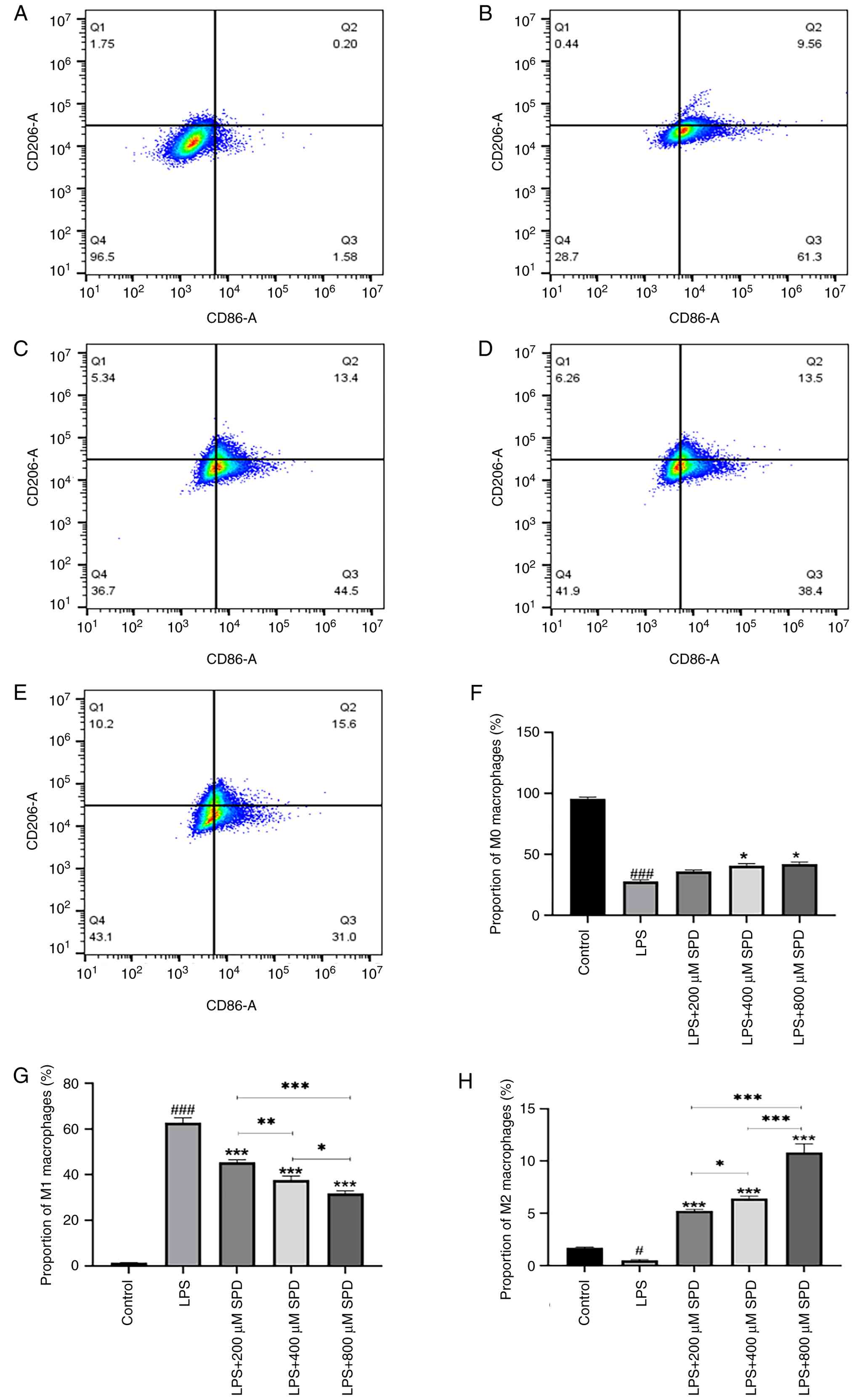 M1-type macrophages express high levels of CD86, whereas M2-type macrophages express CD206(24). The proportions of M1 and M2 cells after LPS-induced polarization of RAW 264.7 cells were ascertained using flow cytometry. CD86-CD206- represents M0 macrophages, CD86+CD206- represents M1 macrophages and CD86-CD206+ represents M2 macrophages. The findings revealed that SPD treatment diminished macrophage CD86 molecule levels and shifted macrophage polarization from a pro-inflammatory M1 phenotype towards an anti-inflammatory M2 phenotype after 24 h; this effect was most notable in response to 800 µM SPD (Fig. 2A-E). The results revealed that LPS stimulation significantly increased the percentage of M1 macrophages and decreased the percentage of M0 or M2 macrophages compared with the control. Co-treatment with SPD dose-dependently reversed this effect. Specifically, increasing SPD concentrations (200, 400 and 800 µM) gradually decreased the M1 percentage while concurrently increasing the M2 percentage. The percentage of M0 macrophages remained largely unchanged across SPD groups. These data indicate that SPD can redirect LPS-induced M1 polarization toward an M2 phenotype in a dose-dependent manner (P<0.05; Fig. 2F-H).