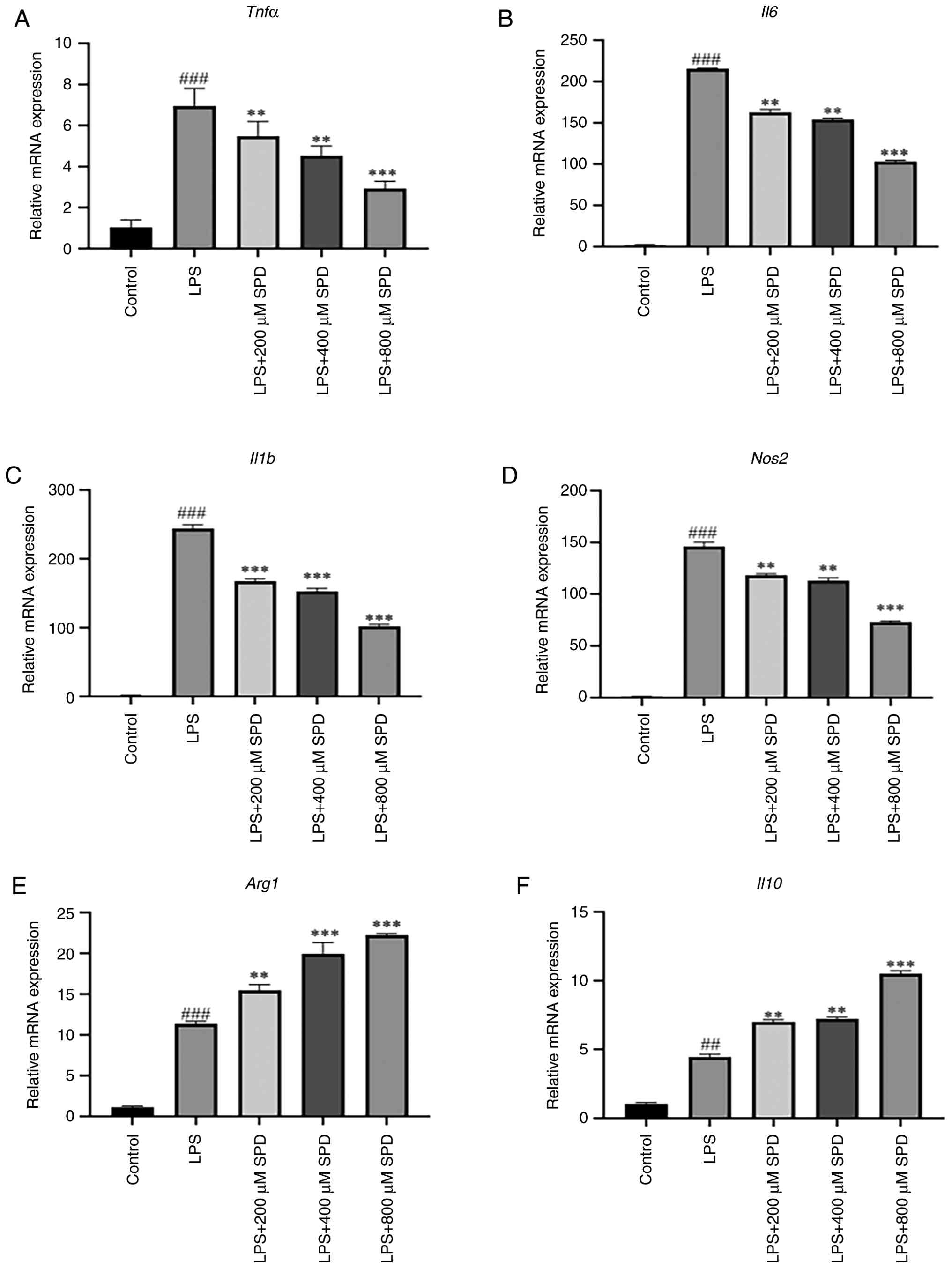 RT-qPCR was performed to assess the ability of LPS to suppress the expression of inflammatory cytokines. LPS significantly elevated the mRNA expression levels of Tnfα, Il6, Il1b and nitric oxide synthase (Nos2) compared with those in the control group (Fig. 3A-D). The mRNA levels of Tnfα, Il6, Il1b and Nos2 then gradually diminished with increasing SPD concentrations, thereby suggesting a significant dose-dependent effect (P<0.01). Relative to those in the control group, LPS significantly elevated the mRNA expression levels of arginase 1 (Arg1) and Il10. Compared with those in the LPS group, the mRNA expression levels of arginase 1 (Arg1) and Il10 were significantly increased in the 200 and 400 µM SPD groups (P<0.01), and peaked after treatment with 800 µM SPD (Fig. 3E and F). Furthermore, SPD treatment reduced the mRNA expression levels of Tnfα, Il6, Il1b and Nos2 at all tested SPD concentrations. These results implied that SPD inhibited autoinflammation.