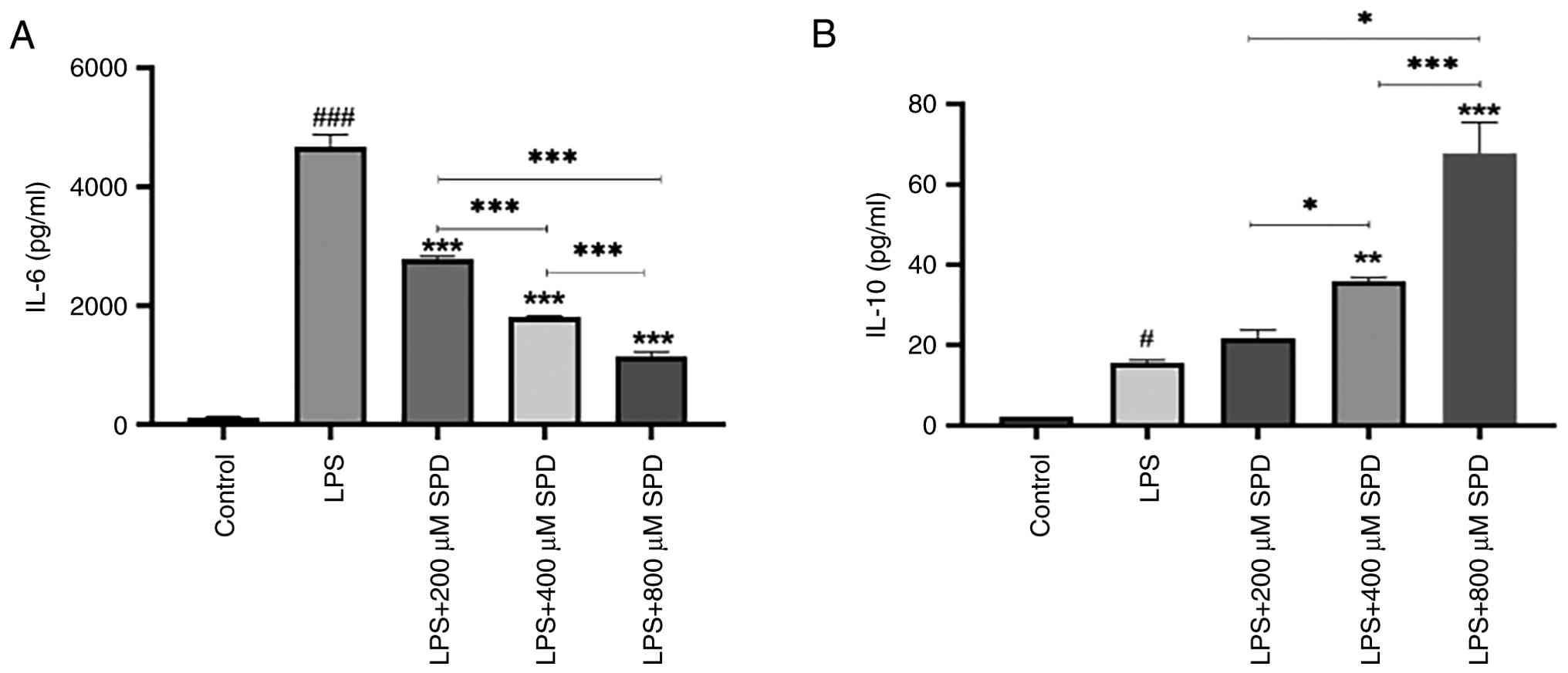A major function of M1-polarized macrophages is the production of pro-inflammatory cytokines. Initially, IL-6 secreted by RAW 264.7 cells into the conditioned medium was examined using ELISA. LPS notably stimulated IL-6 secretion by macrophages compared with that in the control group (Fig. 4A). This suggested that RAW 264.7 cells were activated by LPS stimulation, thereby inducing an inflammatory response. In addition, SPD markedly reduced IL-6 production in a dose-dependent manner compared with that in the LPS group. LPS stimulation led to an elevation in IL-10 levels compared with those in the control group. IL-10 was not significantly induced at the lower SPD concentration (200 µM) but was significantly enhanced compared with that in the LPS group at higher concentrations (400 and 800 µM) (Fig. 4B). These results indicated that SPD may promote anti-inflammatory effects by both inhibiting IL-6 and inducing IL-10 secretion.