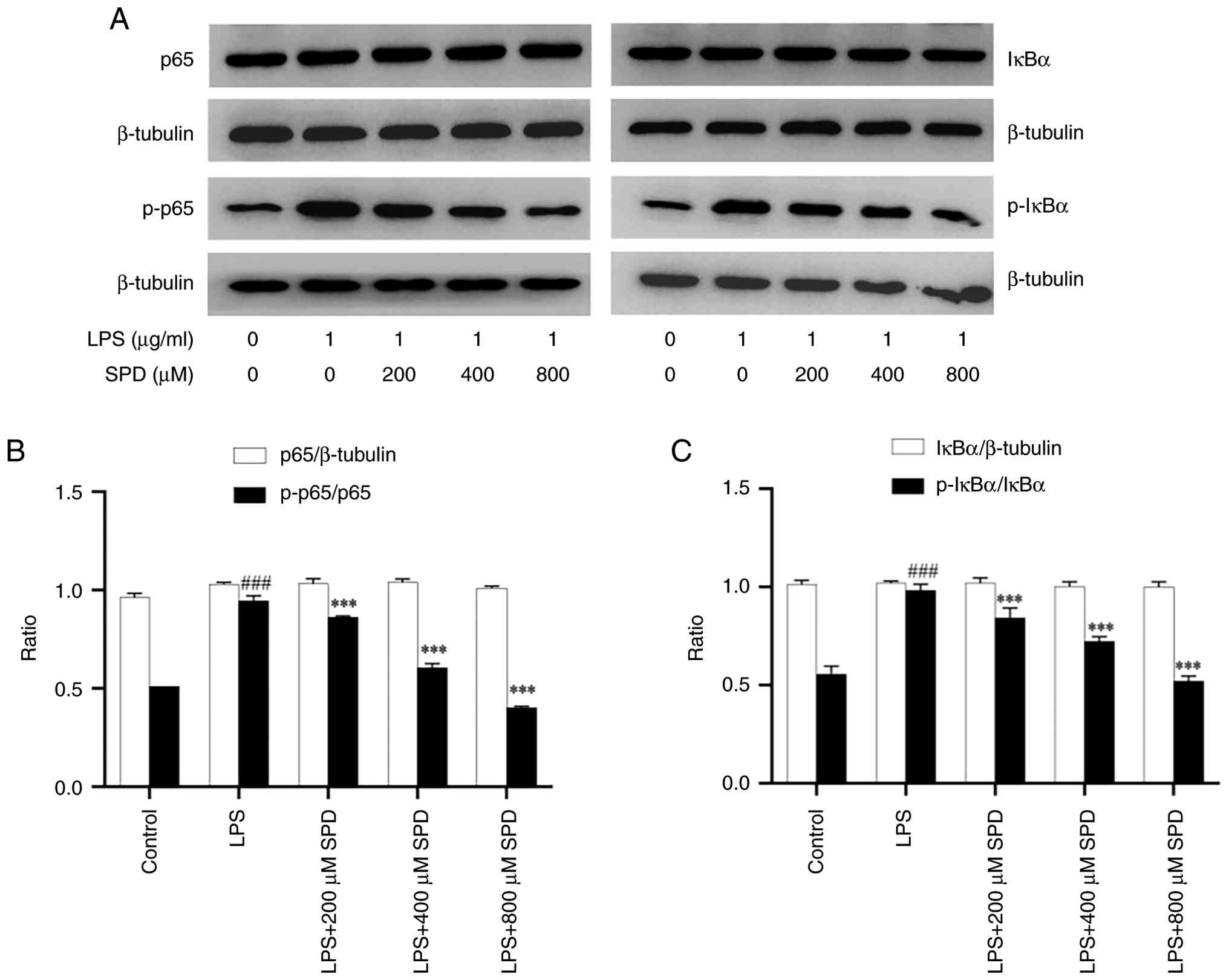 The cells were seeded into 6-well plates and incubated for 24 h. Subsequently, the cells were pretreated with SPD for 1 h and then stimulated with LPS for another 24 h. Immediately after stimulation, total proteins were extracted on ice using RIPA Lysis Buffer (Wuhan Servicebio Technology Co., Ltd.). The protein concentration was determined using a BCA assay (BCA Protein Assay Kit; cat. no. P0012; Beyotime Biotechnology). Equal amounts of protein (20 µg per lane) were separated by 12% SDS-PAGE (cat. no. BL522A; Labgic Technology Co., Ltd.) and transferred onto PVDF membranes (cat. no. IPVH10100, Merckmillipore Co., Ltd.). The membranes were blocked with 5% skimmed milk in Tris-Buffered Saline with Tween-20 (TBST; cat. no. G0004-1L; Wuhan Servicebio Technology Co., Ltd.) for 1 h at room temperature. The membranes were then incubated with the following primary antibodies overnight at 4˚C: p65 (1:1,000; cat. no. 8242; Cell Signaling Technology, Inc.), phosphorylated (p)-p65 (1:1,000; cat. no. 3033; Cell Signaling Technology, Inc.), IκBα (1:1,000; cat. no. 4814; Cell Signaling Technology, Inc.), p-IκBα (1:1,000; cat. no. 2859; Cell Signaling Technology, Inc.) and β-tubulin (1:1,000; cat. no. 10094-1-AP; Proteintech Group, Inc.). After washing with TBST, the membranes were incubated with the corresponding HRP-linked secondary antibodies for 1 h at room temperature, namely anti-rabbit IgG (1:5,000; cat. no. 7074; Cell Signaling Technology, Inc.) and anti-mouse IgG (1:5,000; cat. no. 7076; Cell Signaling Technology, Inc.). The protein bands were visualized using a super-sensitive ECL chemiluminescent substrate (cat. no. BL5965A; Labgic Technology Co., Ltd.) and detected with a chemiluminescence imaging system (ChemiDoc Imaging System, Bio-Rad Laboratories, Inc.). The gray values of the target bands were semi-quantified using ImageJ software version 1.53 (National Institutes of Health) to determine the relative protein expression levels and β-tubulin was used as an internal control.