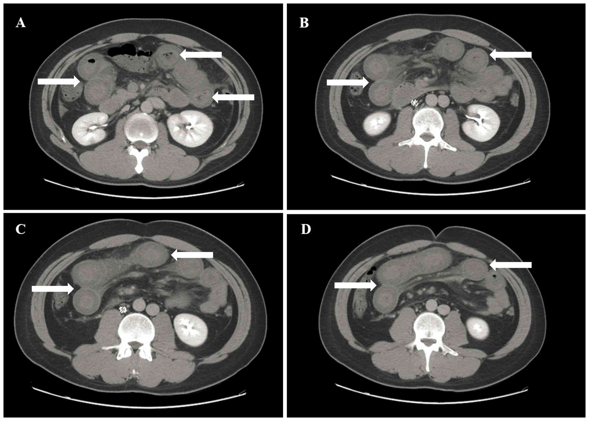 An emergency upper GI endoscopy was performed within 1 h of hematemesis, which revealed no source of bleeding in the esophagus, stomach or duodenum. Furthermore, an abdominal ultrasonography revealed moderate ascites, which was drained under ultrasound guidance, yielding ~500 ml of bloody fluid. An abdominal CT scan exhibited extensive dilation of the small intestine in the upper abdomen, with thickened intestinal walls also observed (maximum thickness, 0.9 cm; Fig. 1).