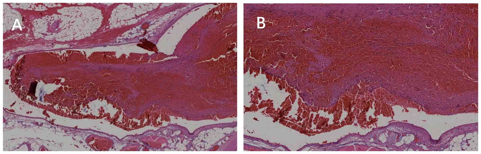 During surgery, a 110-cm segment of necrotic small intestine (180 cm distal to the ligament of Treitz), with thromboembolism in the corresponding mesenteric veins, was identified. The necrotic segment was resected and an end-to-end anastomosis was performed. Pathological examination demonstrated intestinal hemorrhagic infarction (Fig. 2).