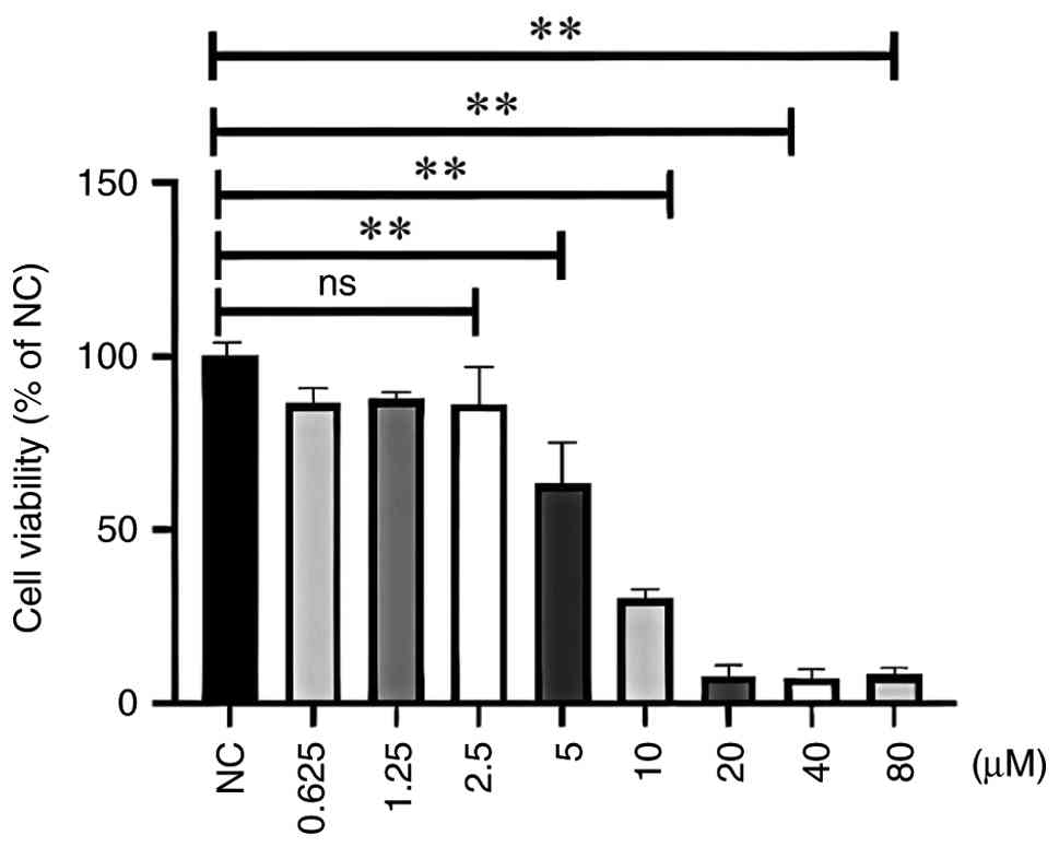 The Caco-2 human colon adenocarcinoma cell line was used in the present study. The cells were cultured in 24-well plates according to a previously published method (9). Briefly, the fully differentiated Caco-2 cells were seeded into 96-well plates at a density of 10,000 cells/well and were cultured in DMEM (cat. no. C11995500BT; Gibco; Thermo Fisher Scientific, Inc.) containing 10% FBS (cat. no. 10091148; Gibco; Thermo Fisher Scientific, Inc.) in an incubator containing 5% CO2 at 37˚C. After adhering to the plate for 24 h, the cell culture medium was discarded and fresh DMEM was supplemented with Ori at distinct concentrations (0.625, 1.25, 2.5, 5.0, 10.0, 20.0, 40.0 and 80.0 µM). After treatment for 24 h at 37˚C, 10 µl Cell Counting Kit (CCK)-8 solution (Sigma-Aldrich; Merck KGaA) was added to each well and the plate was incubated for 1.5 h at 37˚C. The optical density (OD) was determined at 450 nm using a microplate reader (model 550; Bio-Rad Laboratories, Inc.). A total of 6 parallel wells were established at each concentration. Cell viability calculations were repeated three times.