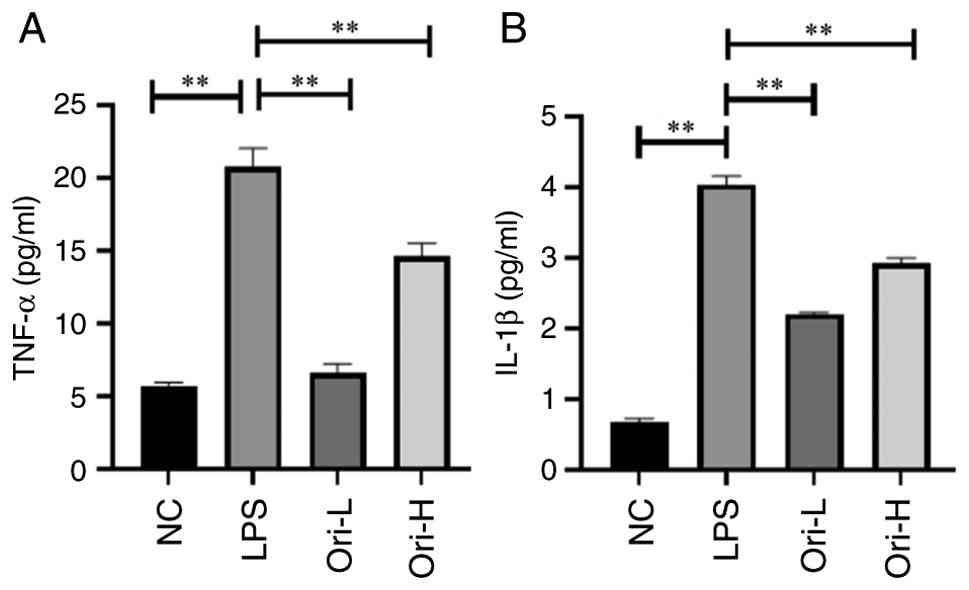 Differentiated, well-grown Caco-2 cells (20 days post-confluence) in 24-well plates at a density of 10,000 cells/well were randomly divided into four groups: Normal control (NC), 20 µg/ml LPS, and LPS (20 µg/ml) + high-dose Ori (2.5 µM, Ori-H) and LPS (20 µg/ml) + low-dose Ori (1.25 µM, Ori-L) groups. Briefly, both Ori-H and Ori-L groups were incubated with Ori for 1 h prior to stimulation with LPS (20 µg/ml) for 12 h at 37˚C. The NC group was incubated with 10 µl 0.75% saline, whereas the LPS group was incubated with LPS (20 µg/ml) for 12 h at 37˚C. At the end of the experiment, the supernatants were collected by centrifugation of the cell culture medium at 3,000 x g for 10 min at 4˚C. The levels of TNF-α and IL-1β in cells were measured by ELISA using commercially available ELISA kits according to the manufacturer's instructions. The human TNF-α (cat. no. 430204) and IL-1β (cat. no. 437007) ELISA kits were obtained from BioLegend, Inc.
