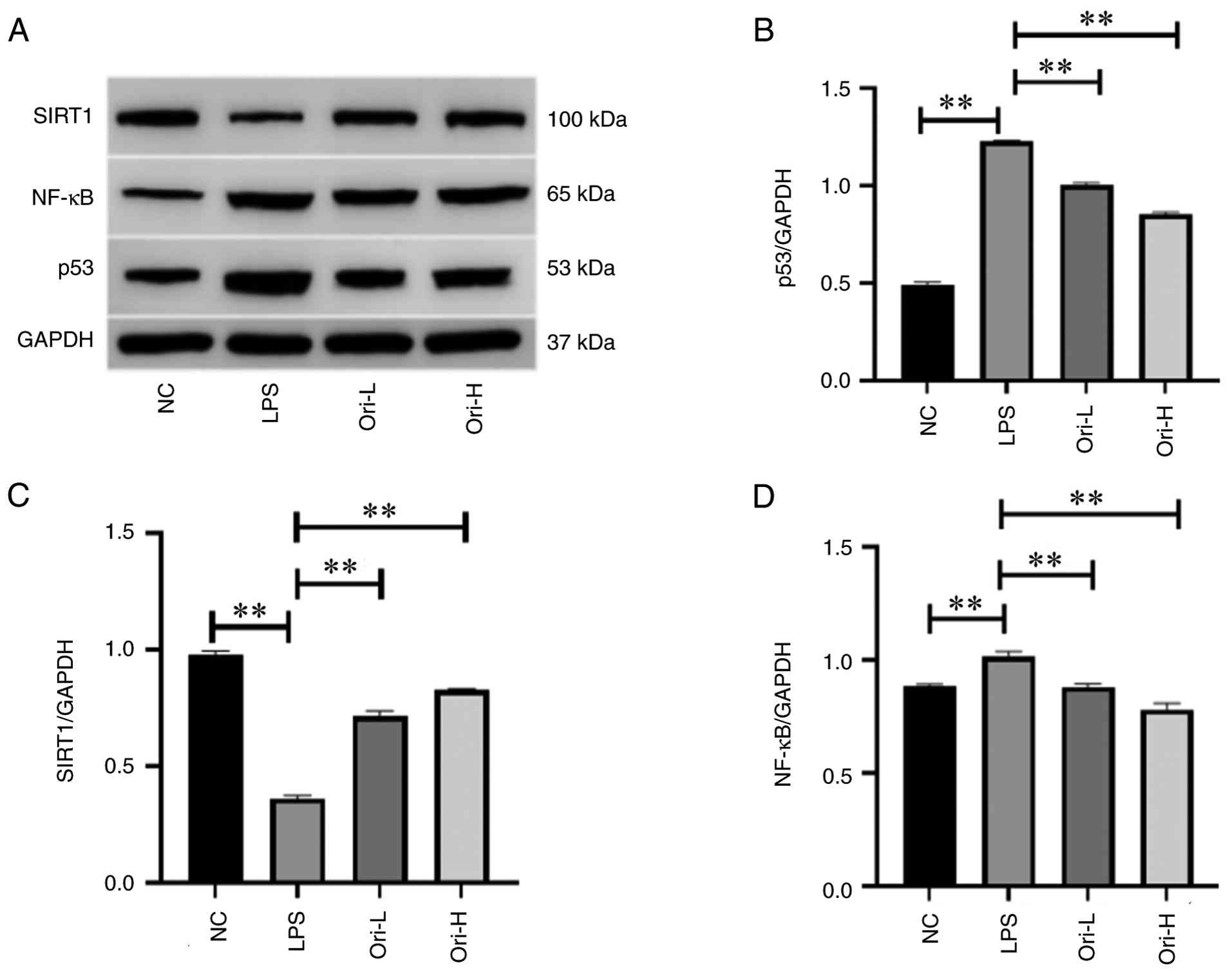 LPS (batch no. L2630) was purchased from MilliporeSigma and Ori (batch no. 17073013) was obtained from Baoji Chenguang Biotechnology Co., Ltd.; the purity of Ori (as determined by high-performance liquid chromatography) was 98%. Both reagents were dissolved in sterile distilled water to a concentration of 10 mM and stored at -20˚C for later use. The following antibodies were purchased from Cell Signaling Technology, Inc. and were used for western blotting: SIRT1 (1:1,000; cat. no. 8469), NF-κB (1:1,000; cat. no. 6956), p53 (1:1,000; cat. no. 18032) and GAPDH (1:1,000; cat. no. 51332); the horseradish peroxidase (HRP)-conjugated secondary antibody (cat. no. 7074) was purchased from Cell Signaling Technology, Inc. (1:5,000).
