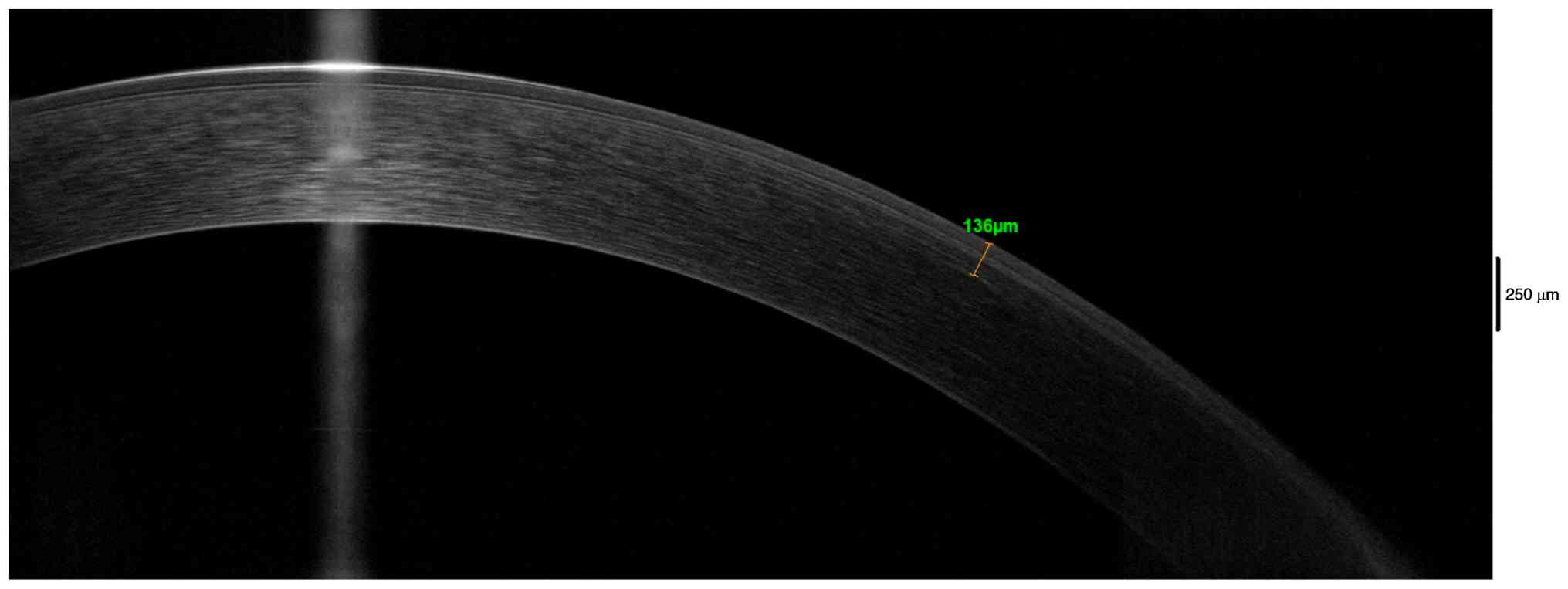 Corneal topography system Sirius (software version phoenix.1; Costruzione Strumenti Oftalmici Srl) showed the left eye had a thinnest corneal thickness of 511 µm, flat keratometry of 43.4 diopter (D) and steep keratometry of 44.1 D. Anterior segment optical coherence tomography (AS-OCT; Optovue, Inc.) revealed a corneal cap thickness of 136 µm in the left eye from the previous SMILE surgery (Fig. 1).