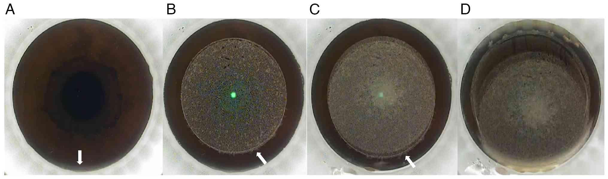At ~2 weeks after the FS-LASIK-Q operation, the videos of the first SMILE surgery of the patient were received from the local hospital and were analyzed to gain experience. During the first suction loss, a small part of the bulbar conjunctiva in the upper area could be observed entering the negative pressure area when establishing negative pressure before laser scanning (Fig. 2A). Subsequently, during the cutting of the lens edge, there was a slight upward displacement (<0.3 mm) of the eye position (Fig. 2B). At the instant before suction loss during cap cutting, the center of the cap was separated from the center of the lens and the eye position shifted upward ~1 mm (Fig. 2C). These sequential positional deviations disrupted the alignment between the laser scanning trajectory and the predesigned surgical zone, which directly contributed to the progressive first suction loss that occurred when 90% of the cap scanning was completed, and the range was approaching to cover the lens. The bubbles dispersed to the limbus within the upper one-third range of the cornea at that time, which turned the cornea white (Fig. 2D). Consequently, the surgeons decided to continue with SMILE without making any modifications to the original treatment plan and re-establish negative pressure for cap scanning.