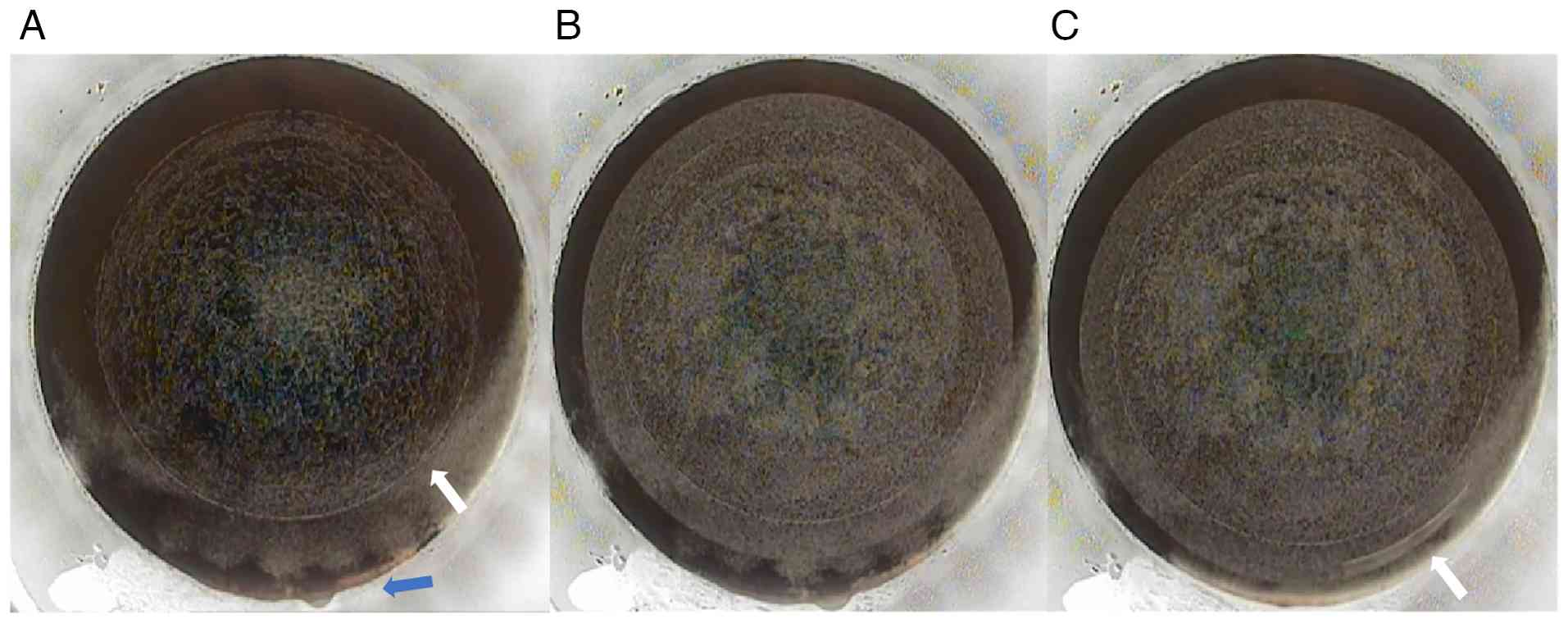 When establishing negative pressure for the second time and before conducting laser scanning, the cutting line of the lens edge could be observed, the upper peripheral corneal area was in a state of bubble dispersion and the bulbar conjunctiva in the upper part entered the negative pressure surface (Fig. 3A). Then the surgeon restarted cap scanning, the center of the cap basically coincided with that of the lens, everything went smoothly until the cap scanning was completed; however, when making the cap incision, the eye position started to move upward again (Fig. 3B). Therefore, the scanning of the cap incision was carried out during the displacement, and in the end the cap incision was not completed, it was in a misaligned position (Fig. 3C). Later the surgeons attempted to separate the incision manually, but it was unsuccessful. Due to the dispersed bubbles above the cornea affecting the surgeon's observation of the scanning status and completion degree of the cap incision, the surgeon did not try to make a mechanical incision.