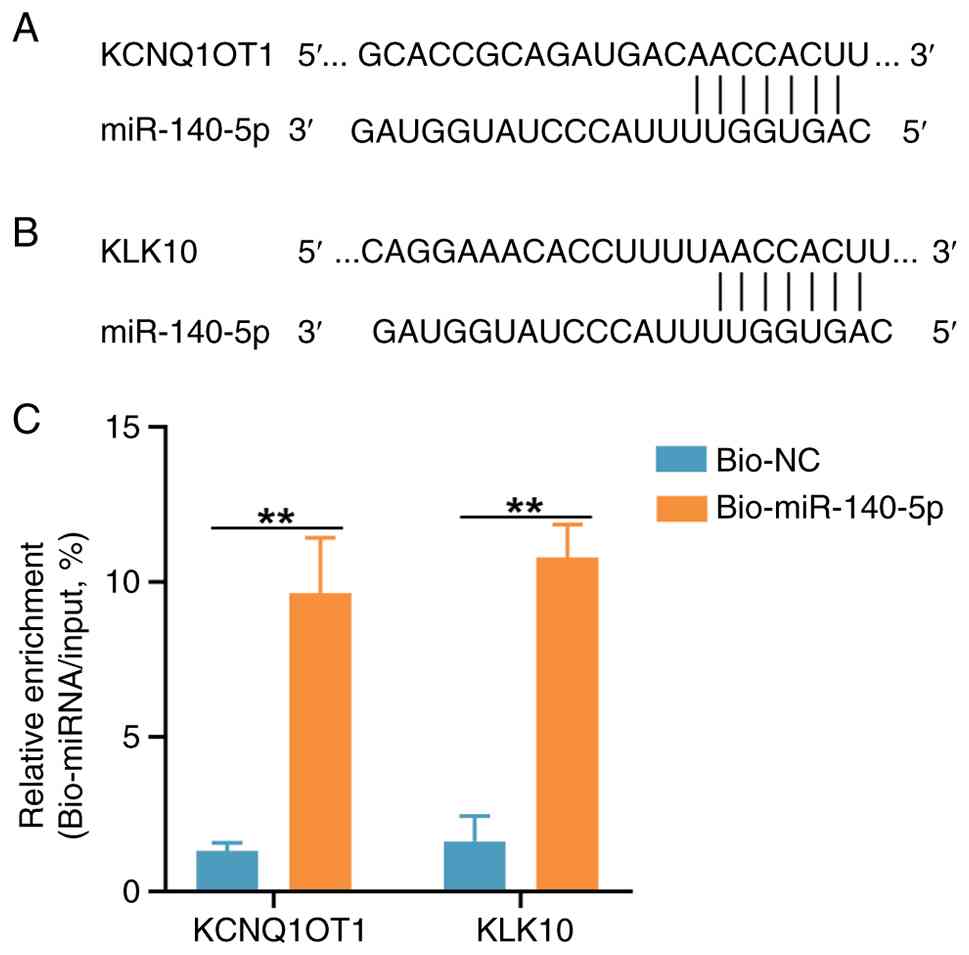 RNA from the aforementioned cell lines was extracted with TRIzol® (Invitrogen; Thermo Fisher Scientific, Inc.), and 2 µg RNA were reverse-transcribed using M-MLV Reverse Transcriptase (Promega Corporation) according to the manufacturer's instructions. The reaction mixture contained dNTPs (Thermo Fisher Scientific, Inc.) and oligo(dT) primers for mRNA detection. For miRNA analysis, specific stem-loop reverse transcription primers were used. Reverse transcription was performed at 42˚C for 60 min, followed by enzyme inactivation at 70˚C for 15 min. qPCR was performed with the SYBR Green Master Mix (Beijing Labgic Technology Co., Ltd.) on a CFX Connect Real-Time PCR System (Bio-Rad Laboratories, Inc.). Cycling conditions were as follows: 95˚C for 1 min, then 40 cycles of 95˚C for 5 sec and 60˚C for 15 sec. The expression level of miR-140-5p was normalized to U6 and that of KCNQ1OT1 and KLK10 to GAPDH, using the 2-ΔΔCq method (21). The following primers were employed: KCNQ1OT1 forward, 5'-TGCAGAAGACAGGACACTGG-3' and reverse, 5'-CTTTGGTGGGAAAGGACAGA-3'; KLK10 forward, 5'-GAGTGTGAGGTCTTCTACCCTG-3' and reverse, 5'-ATGCCTTGGAGGGTCTCGTCAC-3'; GAPDH forward, 5'-TGCACCACCAACTGCTTAGC-3' and reverse, 5'-GGCATGGACTGTGGTCATGAG-3'; miR-140-5p forward, 5'-AGGCGCCAGTGGTTTTACC-3' and reverse (universal), 5'-CAGTGCAGGGTCCGAGGT-3'; and U6 forward, 5'-CTCGCTTCGGCAGCACA-3' and reverse, 5'-AACGCTTCACGAATTTGCGT-3'.
