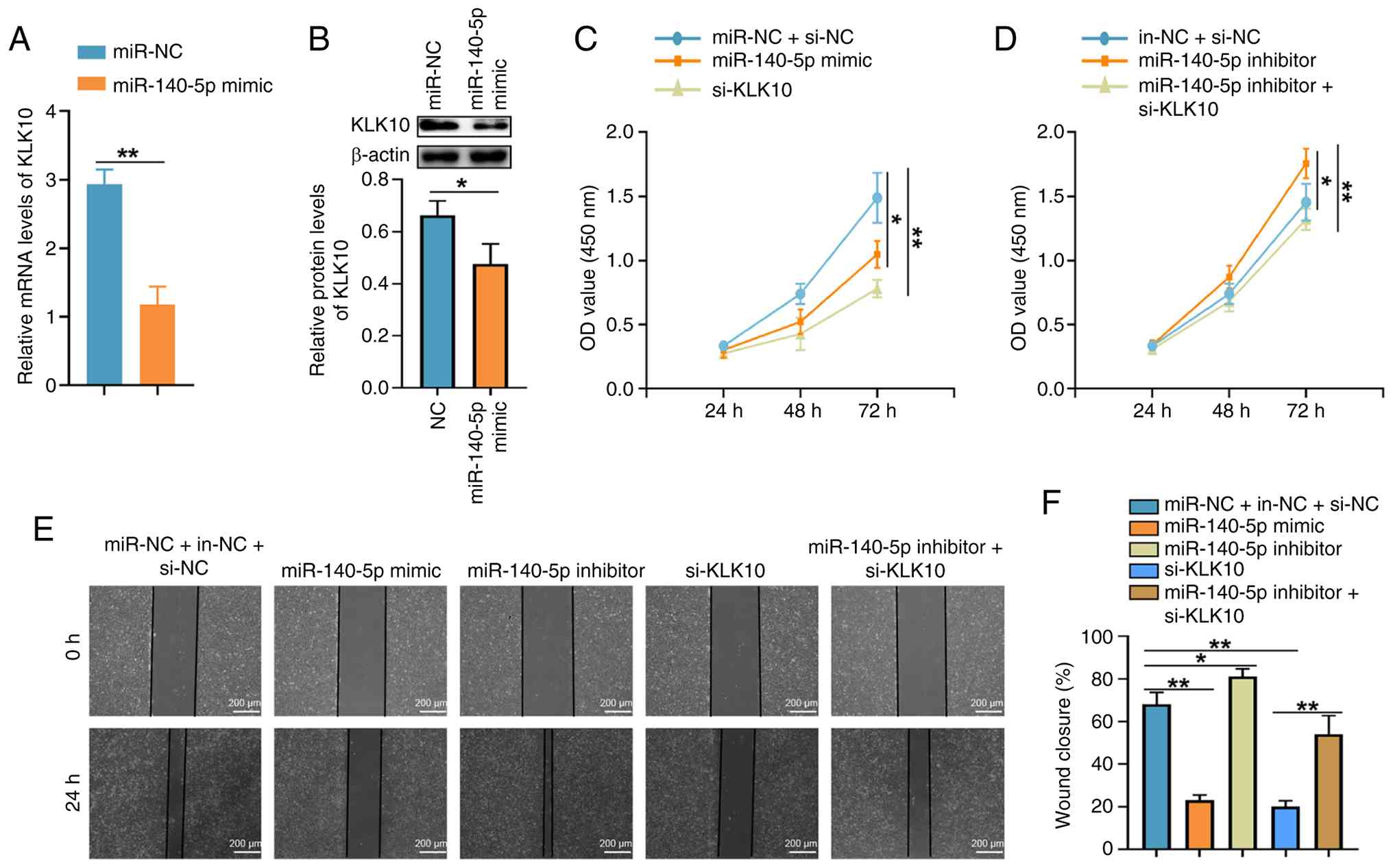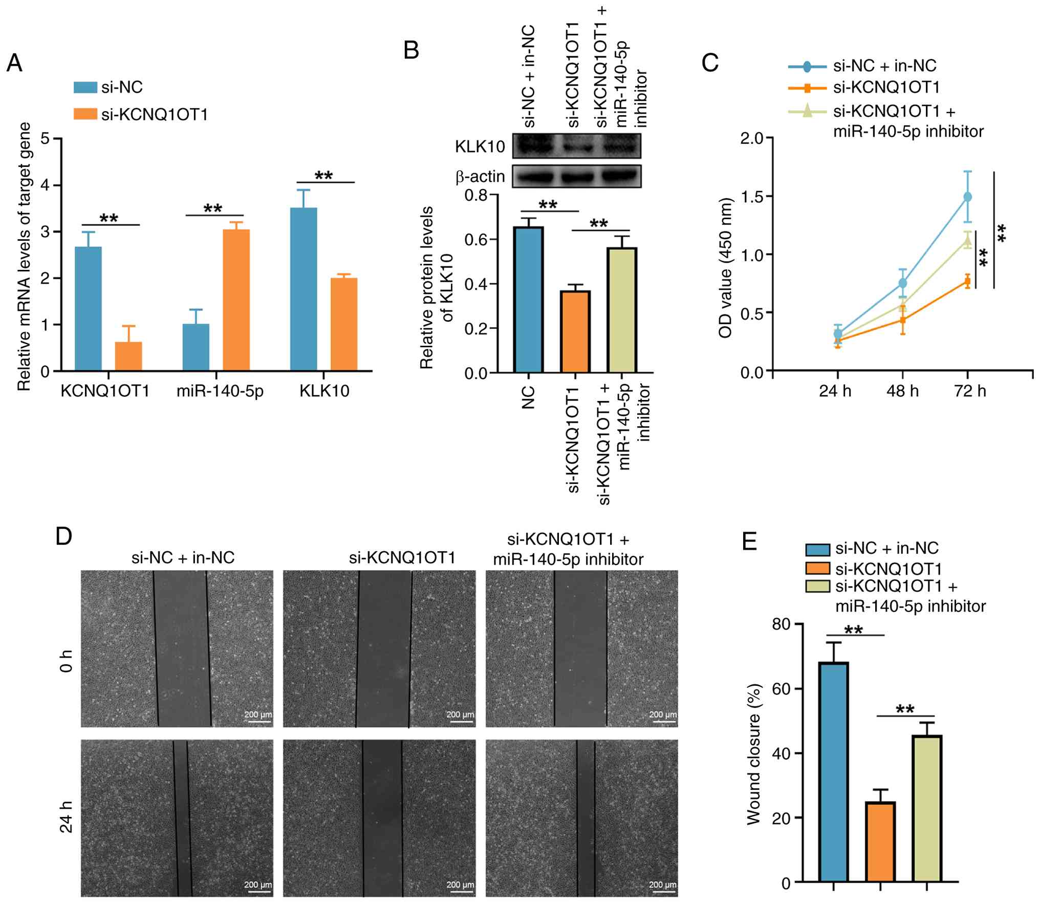 Logarithmic-phase SKOV3 cells were seeded into 6-well plates at a density of 2x105 cells per well and transfected (30-50% confluence) using the riboFET CP Transfection Kit (Guangzhou RiboBio Co., Ltd.) as per the manufacturer's instructions. Small interfering (si)-KCNQ1OT1, si-KLK10, miR-140-5p mimic/inhibitor and negative controls (si-NC, miR-NC and inhibitor-NC, respectively) were provided by Guangzhou Ribo Co., Ltd. Cells were incubated with transfection complexes at 37˚C in a humidified atmosphere containing 5% CO2 for 24-72 h depending on the subsequent experimental design. Transfection efficiency was verified using reverse transcription-quantitative PCR (RT-qPCR) 36 h after transfection. The final transfected oligonucleotide concentration was 50 nM, with sequences as follows: si-KCNQ1OT1 sense, 5'-GGUAGAAUAGUUCUGUCUU-3' and antisense, 5'-AAGACAGAACUAUUCUACC-3'; si-KLK10 sense, 5'-CUGGAUCAAUAAAGUCAUA-3' and antisense, 5'-UAUGACUUUAUUGAUCCAG-3'; miR-140-5p mimic sense, 5'-CAGUGGUUUUACCCUAUGGUAG-3' and antisense, 5'-CUACCAUAGGGUAAAACCACUG-3'; and miR-140-5p inhibitor, 5'-CUACCAUAGGGUAAAACCACUG-3'. According to the manufacturer's description, miR-140-5p inhibitor is a chemically modified antisense oligonucleotide that primarily mediates functional inhibition by binding to mature miR-140-5p and blocking its interaction with target mRNA. Detailed information regarding miR-140-5p inhibitor is available on the manufacturer's website (https://www.ribobio.com/product-and-service/mirna-function-reagent/mirna-inhibitor/). According to the manufacturer's policy, the exact sequences of si-NC (cat. no. siN0000001-1-5), miR-NC (cat. no. miR1N0000001-1-5) and inhibitor-NC (cat. no. miR2N0000001-1-5) are proprietary and therefore not disclosed. These NCs were designed by Guangzhou RiboBio Co., Ltd. and have no marked homology to any known human transcripts.