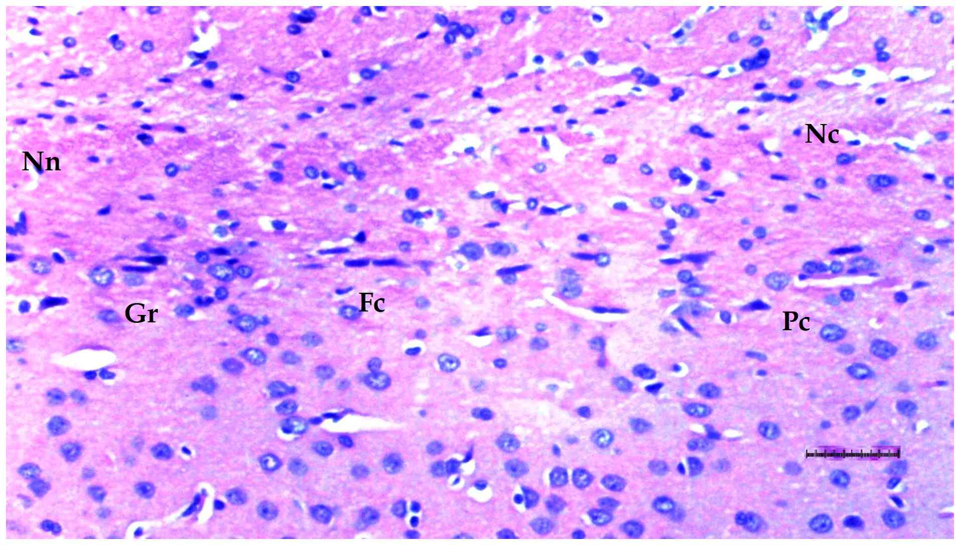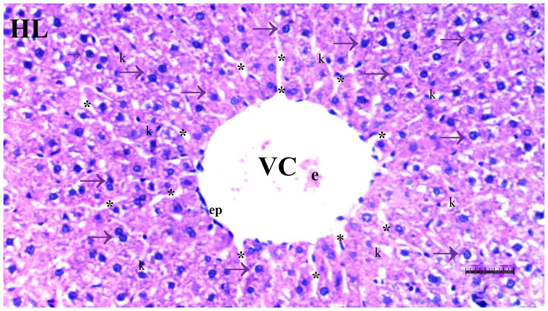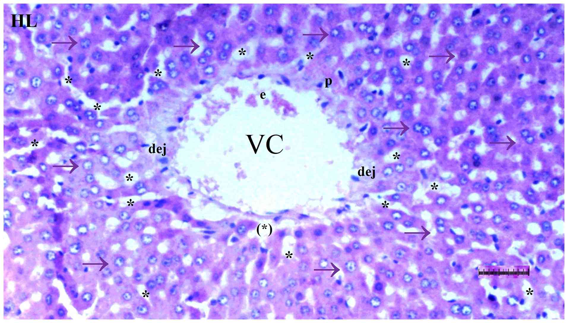 Liver, heart and brain tissues were fixed in 10% neutral-buffered formalin at room temperature (20-25˚C) for 24 h and embedded in paraffin. Paraffin blocks were sectioned at a 4-µm thickness using a rotary microtome. After deparaffinization in xylene and rehydration through graded ethanol, sections were stained with hematoxylin (5 min) and eosin (2 min) at room temperature. These sections were two experienced histopathologists, blinded to the procedures, using a semiquantitative grading scale (0, no change; +1, minimal change; +2, moderate change; +3, severe change) (29).