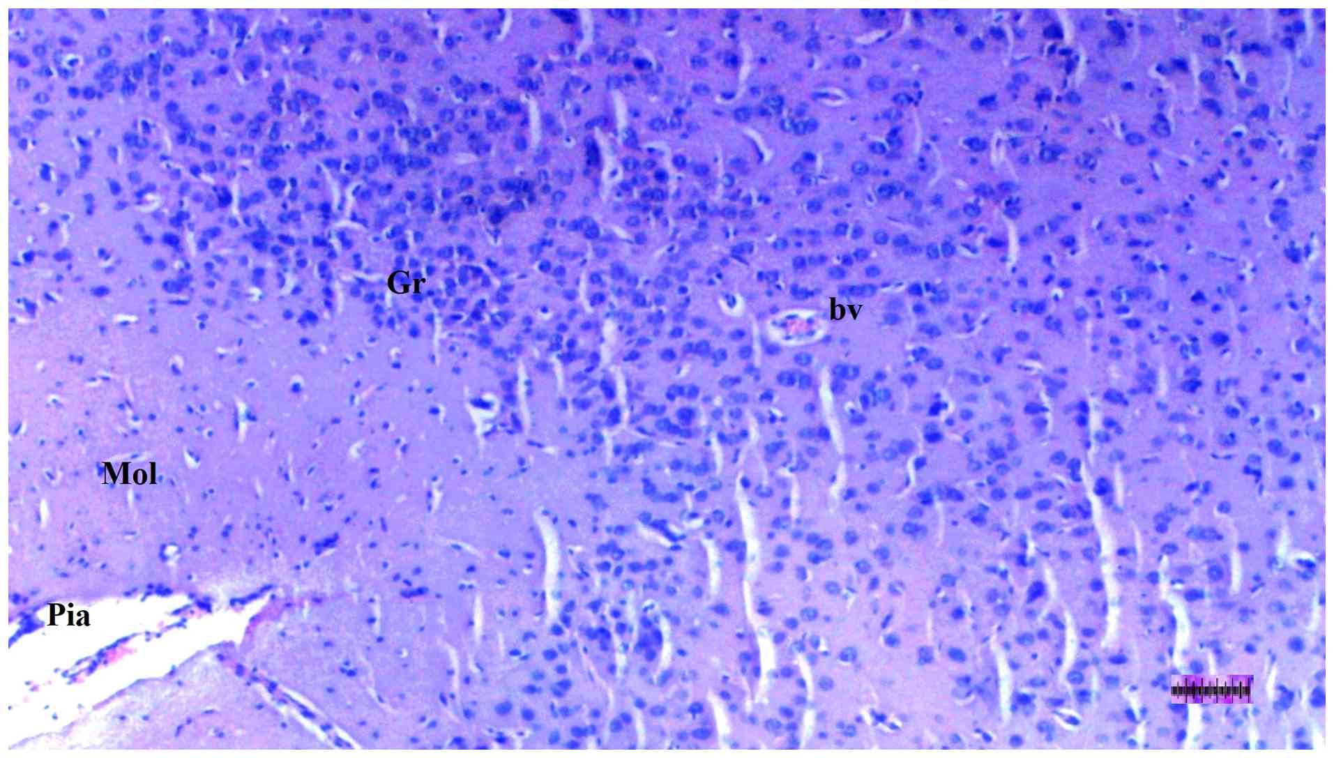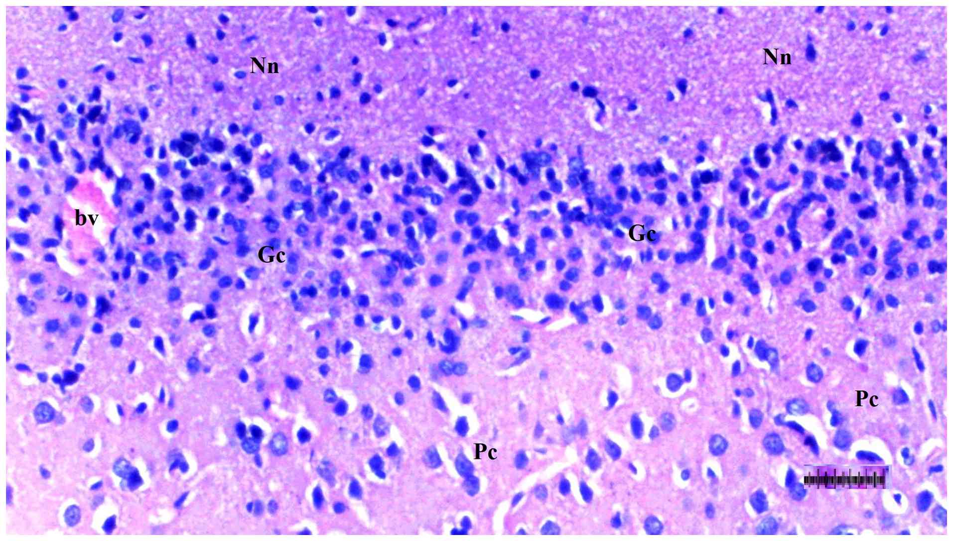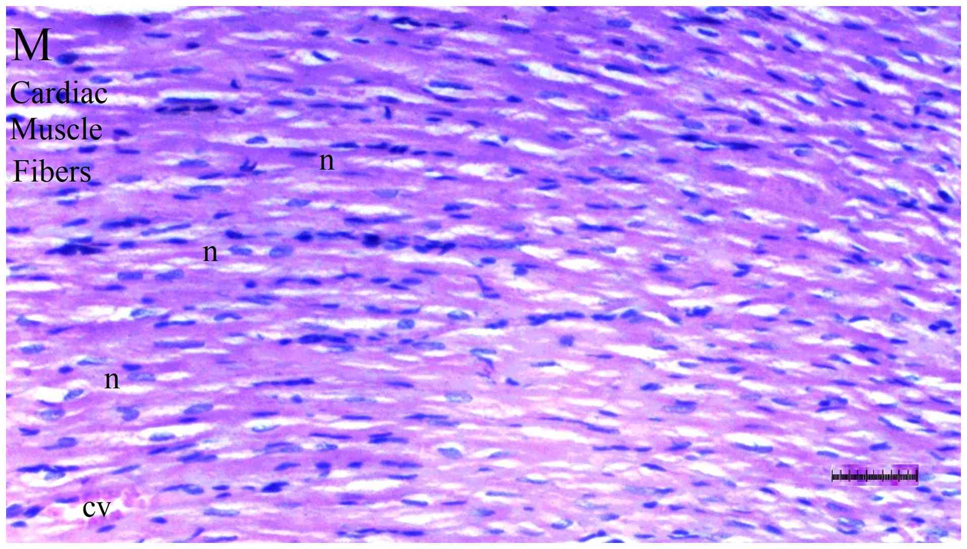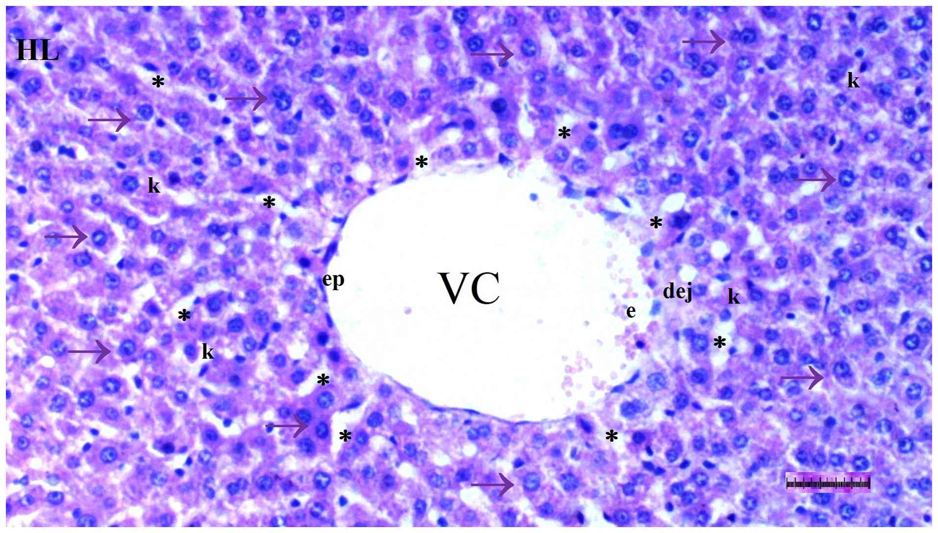 Liver, heart and brain tissues were fixed in 10% neutral-buffered formalin at room temperature (20-25˚C) for 24 h and embedded in paraffin. Paraffin blocks were sectioned at a 4-µm thickness using a rotary microtome. After deparaffinization in xylene and rehydration through graded ethanol, sections were stained with hematoxylin (5 min) and eosin (2 min) at room temperature. These sections were two experienced histopathologists, blinded to the procedures, using a semiquantitative grading scale (0, no change; +1, minimal change; +2, moderate change; +3, severe change) (29).